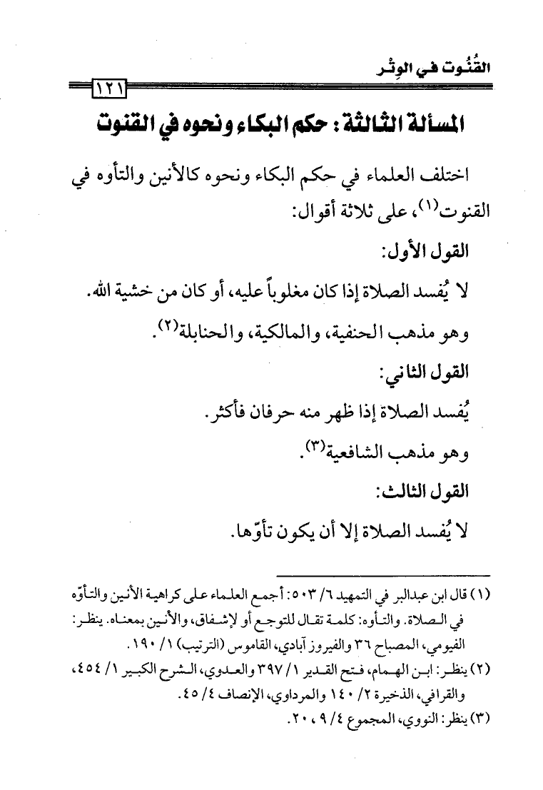اختلف العلماء في حكم البكاء ونحوه كالأنين والتأوه في القنوت (¬1)، على ثلاثة أقوال: