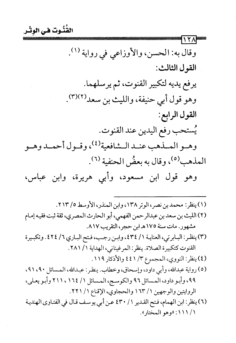(¬3) ينظر: البابرتي، العناية (1/ 434)، وابن رجب، فتح الباري (6/ 424). وتكبيرة القنوت كتكبيرة الصلاة. ينظر: المرغياني، الهداية (1/ 281).