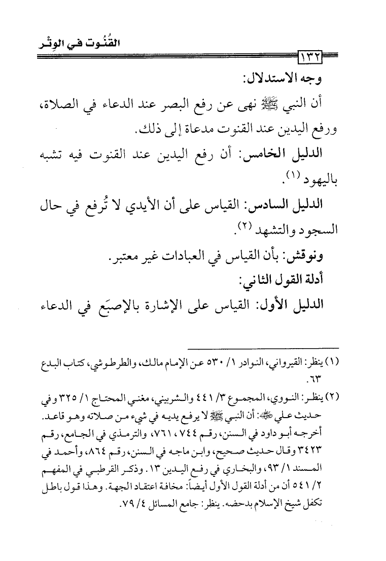 (¬2) ينظر: النووي، المجموع (3/ 441)، والشربيني، مغني المحتاج (1/ 325)، وفي حديث علي - رضي الله عنه -: أن النبي - صلى الله عليه وسلم - لا يرفع يديه في شيء من صلاته وهو قاعد. أخرجه أبو داود في السنن (744، 761)، والترمذي في الجامع (3423) وقال حديث صحيح، وابن ماجة في السنن (864)، وأحمد في المسند (1/ 93)، والبخاري في رفع اليدين (13). وذكر القرطبي في المفهم (2/ 541) أن من أدلة القول الأول أيضا: مخافة اعتقاد الجهة. وهذا قول باطل تكفل شيخ الإسلام بدحضه. ينظر: جامع المسائل (4/ 79).