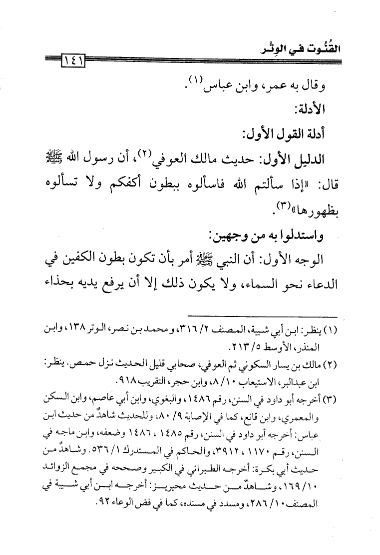 الدليل الأول: حديث مالك العوفي (¬2)، أن رسول الله - صلى الله عليه وسلم - قال: «إذا سألتم الله فاسألوه ببطون أكفكم ولا تسألوه بظهورها» (¬3).