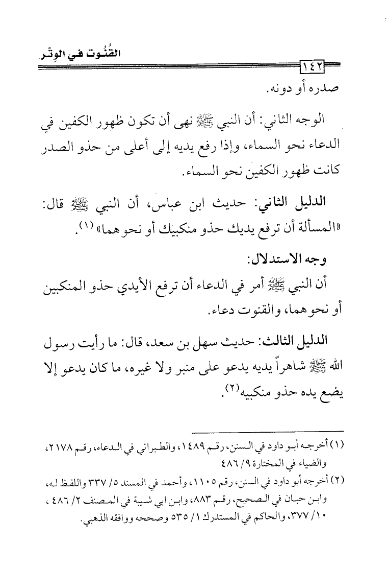 الدليل الثالث: حديث سهل بن سعد، قال: ما رأيت رسول الله - صلى الله عليه وسلم - شاهراً يديه يدعو على منبر ولا غيره، وما كان يدعو إلا يضع يده حذو منكبيه (¬2).