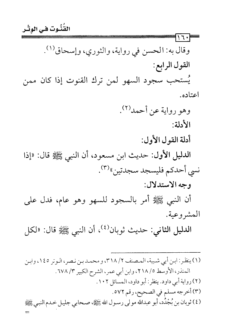 (¬1) ينظر: ابن أبي شيبة، المصنف (2/ 318)، ومحمد بن نصر، الوتر (145)، وابن المنذر، الأوسط (5/ 218)، وابن أبي عمر، الشرح الكبير (3/ 678).