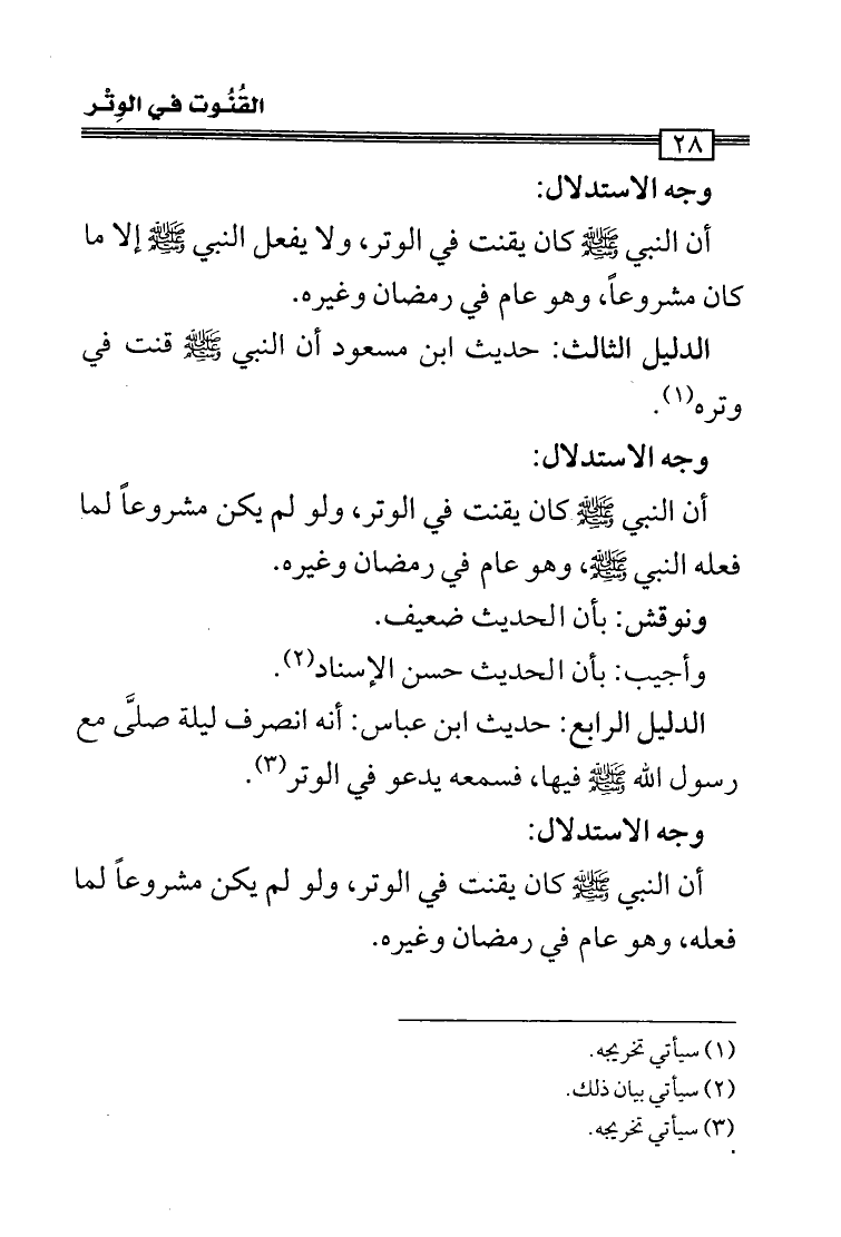 الدليل الثالث: حديث ابن مسعود أن النبي - صلى الله عليه وسلم - قنت في وتره (¬1).