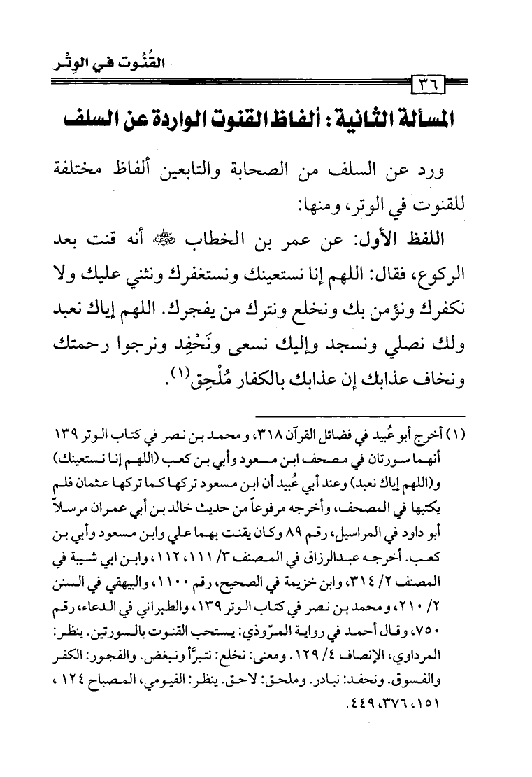 (¬1) أخرجه أبو عُبيد في فضائل القرآن (318)، ومحمد بن نصر في كتاب الوتر (139) أنهما سورتان في مصحف ابن مسعود وأبي بن كعب (اللهم إنا نستعينك) و (اللهم إياك نعبد وعند أبي عُبيد أن ابن مسعود تركها كما تركها عثمان فلم يكتبها في المصحف، وأخرجه مرفوعا من حيث خالد بن أبي عمران مرسلا أبو داود في المراسيل، رقم (89) وكان يقنت بهما علي وابن مسعود وأبي بن كعب. أخرجه عبد الرزاق في المصنف (3/ 111، 112)، وابن أبي شيبة في المصنف (2/ 314)، وابن خزيمة في الصحيح (1100)، والبيهقي في السنن (2/ 210)، ومحمد بن نصر في كتاب الوتر (139)، والطبراني في الدعاء، رقم (750)، وقال أحمد في رواية المروذي: يستحب القنوت بالسورتين. ينظر: المرداوي، الإنصاف (4/ 129). ومعنى: نخلع: نتبرأ ونبغض. والفجور: الكفر والفسوق. ونحفد: نبادر. وملحق: لاحق. ينظر: الفيومي، المصباح (124، 376، 449).