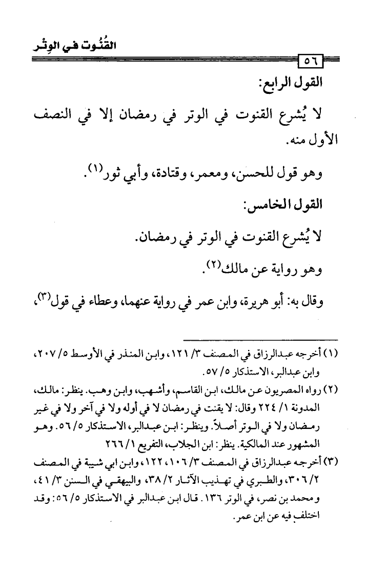 (¬2) رواه المصريين عن مالك، ابن القاسم، وأشهب، وابن وهب. ينظر: مالك، المدونة (1/ 224) وقال: لا يقنت في رمضان لا في أوله ولا في آخره ولا في غير رمضان ولا في الوتر أصلا. وينظر: ابن عبد البر، الاستذكار (5/ 56). وهو المشهور عند المالكية. ينظر: ابن الجلاب، التفريع (1/ 266).
