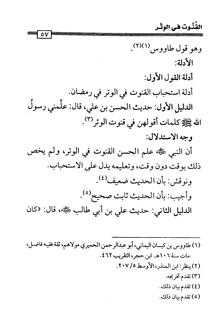 الدليل الأول: حديث الحسن بن علي، قال: علمني رسول الله - صلى الله عليه وسلم - كلمات أقولهن في قنوت الوتر (¬3).