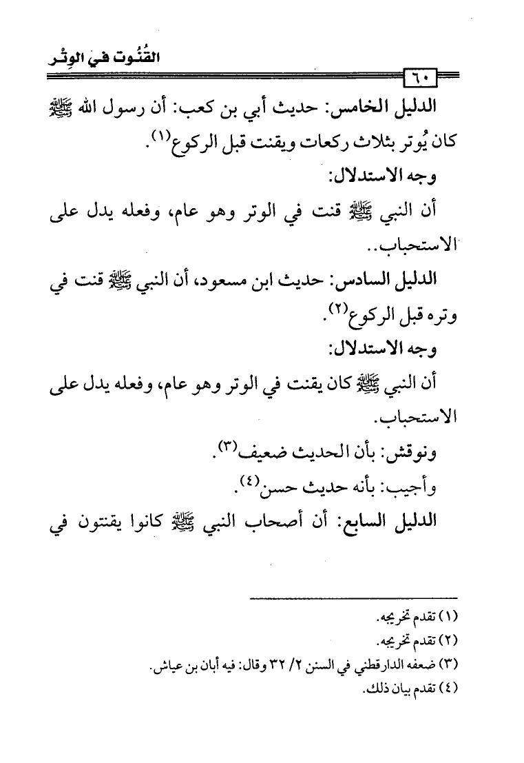 الدليل الخامس: حديث أبي بن كعب: أن رسول الله - صلى الله عليه وسلم - كان يُوتر بثلاث ركعات ويقنت قبل الركوع (¬1).