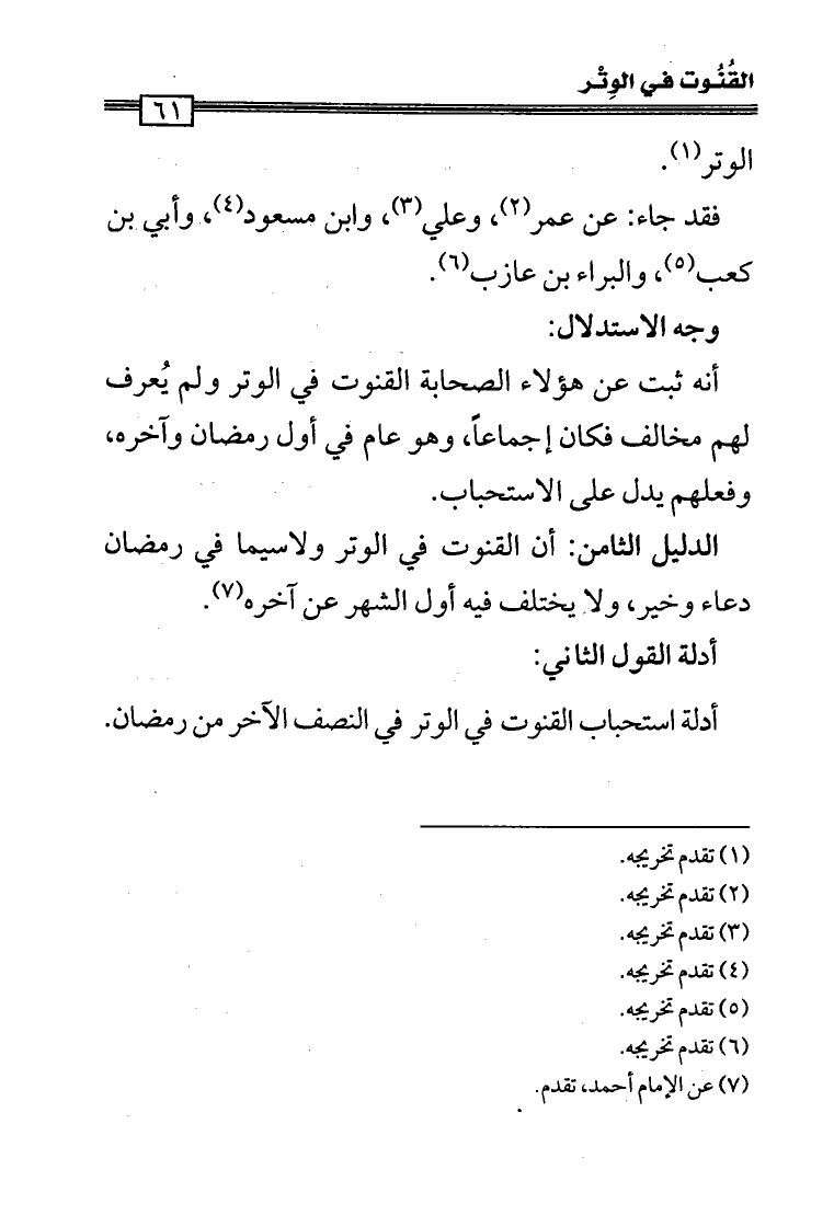 أدلة استحباب القنوت في الوتر في النصف الآخر من رمضان.
