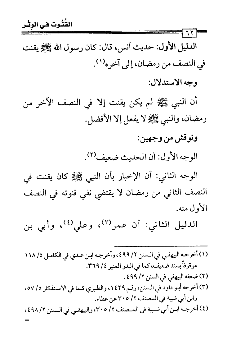 الدليل الأول: حديث أنس، قال: كان رسول الله - صلى الله عليه وسلم - يقنت في النصف من رمضان، إلى آخره (¬1).