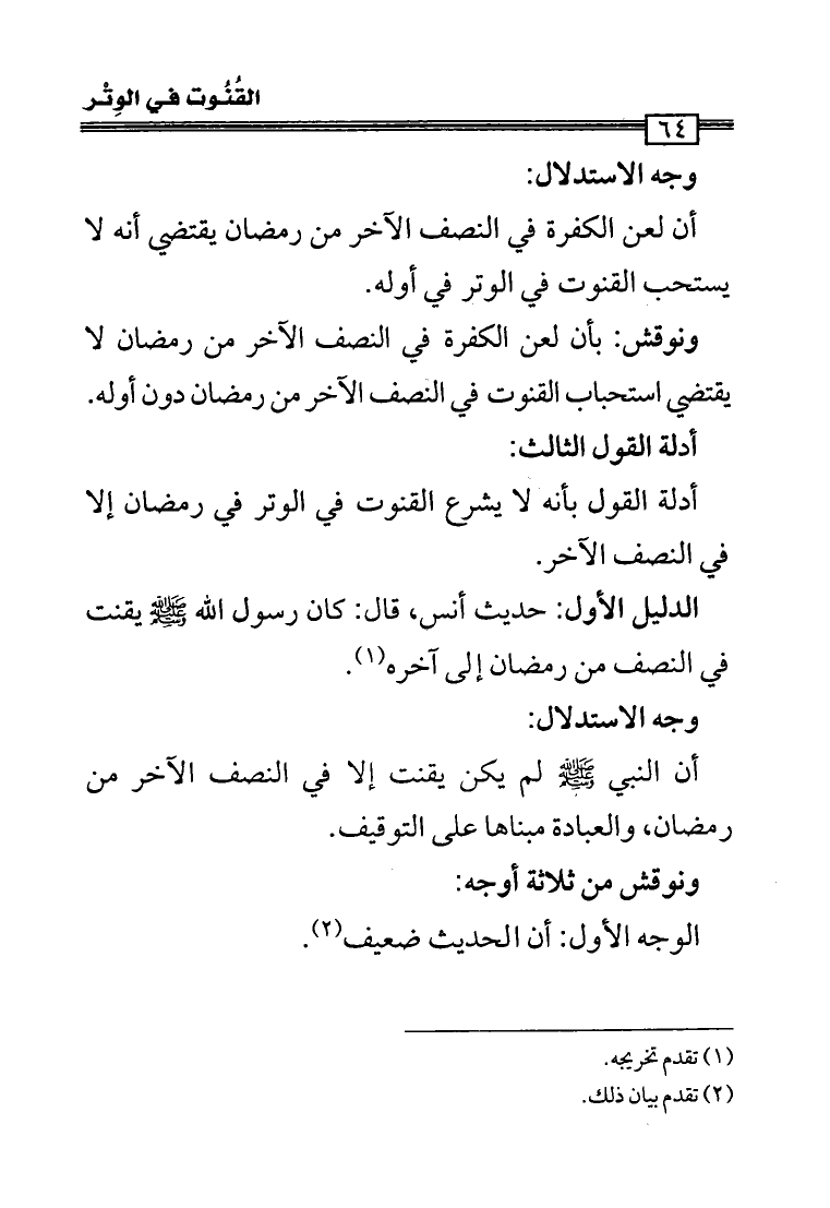 ونوقش: بأن لعن الكفرة في النصف الآخر من رمضان لا يقتضي استحباب القنوت في النصف الآخر من رمضان دون أوله.