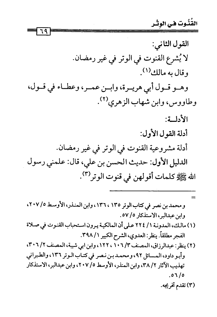(¬2) ينظر: عبد الرزاق المصنف (3/ 106، 122)، وابن أبي شيبة، المصنف (2/ 306)، وأبو داود، المسائل (92)، ومحمد بن نصر في كتاب الوتر (136)، والطبراني، تهذيب الآثار (2/ 38)، وابن المنذر، الأوسط (5/ 207)، وابن عبد البر، الاستذكار (5/ 56).