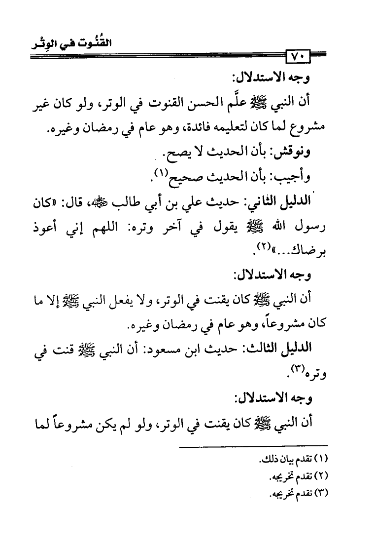 الدليل الثالث: حديث ابن مسعود: أن النبي - صلى الله عليه وسلم - قنت في وتره (¬3).