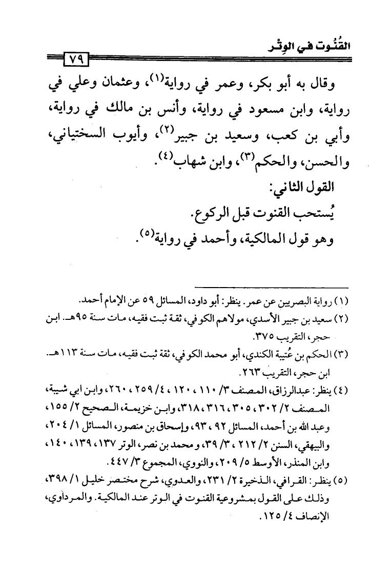 (¬5) ينظر: القرافي، الذخيرة (2/ 231)، والعدوي، شرح مختصر خليل (1/ 398)، وذلك على القول بمشروعية القنوت في الوتر عند المالكية. والمرداوي، الإنصاف (4/ 125).
