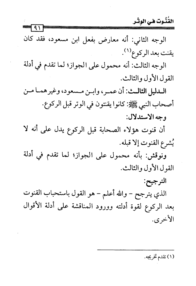 الدليل الثالث: أن عمر، وابن مسعود، وغيرهما من أصحاب النبي - صلى الله عليه وسلم -: كانوا يقنتون في الوتر قبل الركوع.