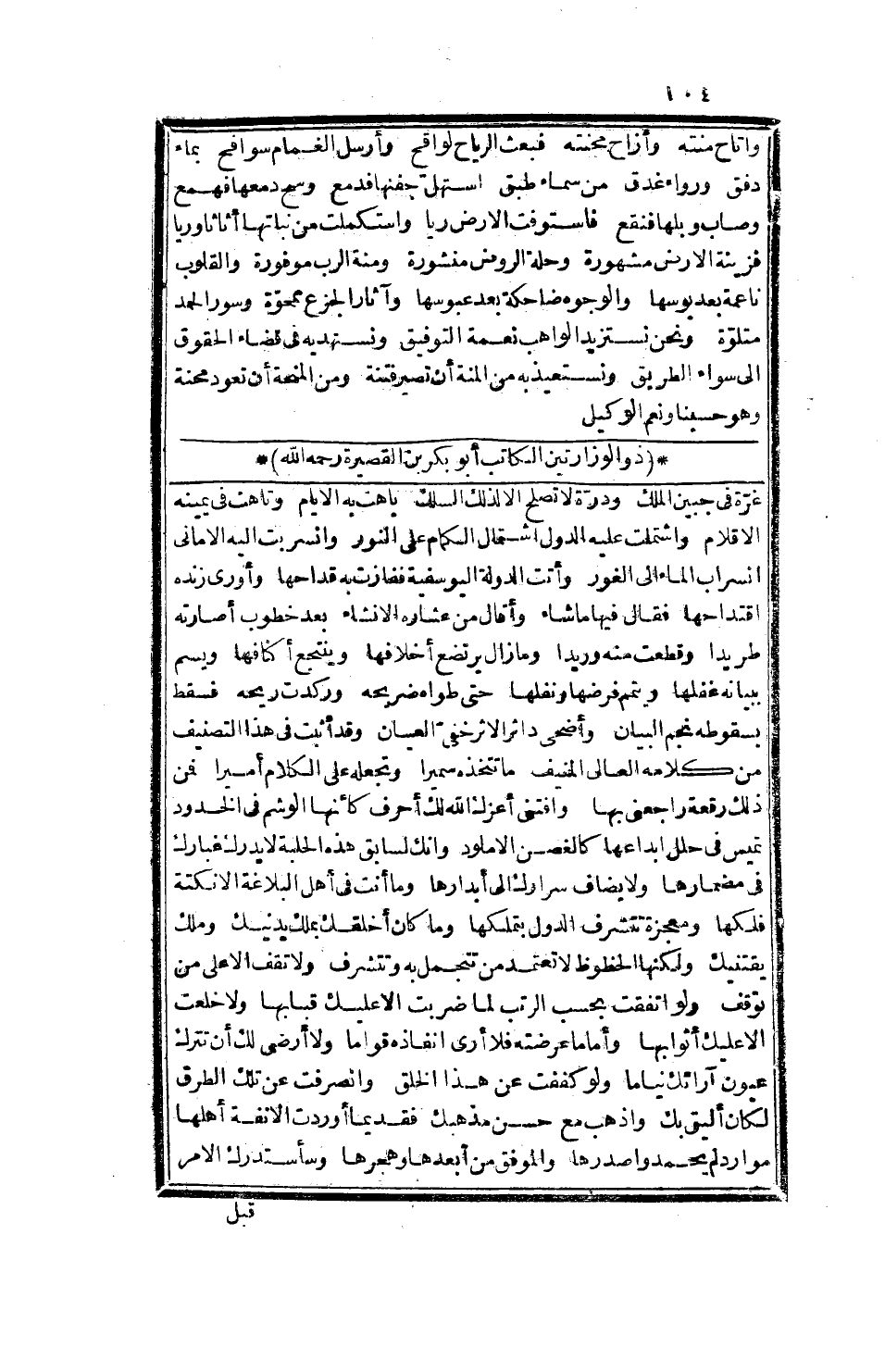 إليه الأماني انسراب الماء إلى الغور، وأتت الدولة اليوسفية ففازت به قداحها، وأورى زنده اقتداحها، فقال فيها ما شاء، وأقال من عثاره الإنشاء، بعد خطوب أصارته طريدا، وقطعت منه وريدا، وما زال يرتضع أخلافها، وينتجع أكتفها، ويبسم ببيانه غفلها، ويتمم فرضها ونفلها، حتى طواه ضريحه، وركدت ريحه، فسقط بسقوطه نجم البيان، وأضحى دائر الأثر خفي العيان، وقد أثبتت في هذا التصنيف، من كلامه العالي المنيف، ما تتخذه سميرا، وتجعله على الكلام أميرا، فمن ذلك رقعة راجعني بها، وافتني أعزك الله لك أحرف كأنها الوشم في الخدود، تميس في حلل إبداعها كالغصن الأملود، وأنك لسابق هذه الحلبة لا يدرك غبارك في مضمارها، ولا يضاف سرارك إلى أبدارها، وما أنت في أهل البلاغة إلا نكتة فلكها، ومعجزة تتشرف الدول بتملكها، وما كان أخلقك بملك يدينك، وملك يقتنيك، ولكنها الحظوظ لا تعتمد من تتجمل به وتتشرف، ولا تقف إلى على من توقف، ولو اتفقت بحسب الرتب لما ضربت إلا عليك قبابها، ولا خلعت إلا عليك أثوابها، وأما ما عرضت فلا أرى أنفاذه أقواما، ولا أرضى لك أن تترك عيون أرائك نياما، ولو كففت من هذا الخلق، وانصرفت عن تلك الطرق، لكن أليق بك، واذهب مع حسن مذهبك، وقديماً أوردت الأنفة أهلها، موارد لم حمدوا صدرها، والموفق من أبعدها وهجرها، وسأستدرك الأمر قبل فواته، وأرهف لك مفلول شباته، فتوقف قليلاً، ولا تنفذ فيه دبراً ولا قبيلاً، حتى ألقاك هذه العشية وأعلمك بما تنبني عليه القضية، إن شاء الله، وكتب عن أمير المسلمين وناصر الدين أيده الله إلى طائفة متعدية، وأما بعد يا أمة اتعقل رشدها، ولا تجري إلى اتقتضيه نعم الله عندها، ولا تقلع عن أذى تفشيه قرباً وبعدا وجهدها، فإنكم لا ترعون لجار ولا لغيره حرمة، ولا تراقبون في مومن إلا ولا ذمة، فد أعماكم عن مصالحكم الأشر، وأضلكم ضلالاً بعيداً البطر، ونبذتم المعروف وراء ظهوركم، وأتيتم ما ينكر مقتديا في ذلك صغيركم بكبيركم، وخاملكم بمشهوركم، ليس فيكم زاجر، ولا منكم إلا غوي فاجر، ولم نرى إلا أن الله عز وجل قد شاء مسلخكم، وأراد نسخكم وفسخكم، فسلط عليكم الشيطان ويغركم ويغريكم، ويزين لكم قبائح معاصيكم، وكأنكم به قد نكص على عقبيه عنكم، وقال أني بريء منكم، وترككم في صفقة خاسرة، لا تستقيلونها إن لم تتوبوا في دنيا ولا آخره، وحسبنا