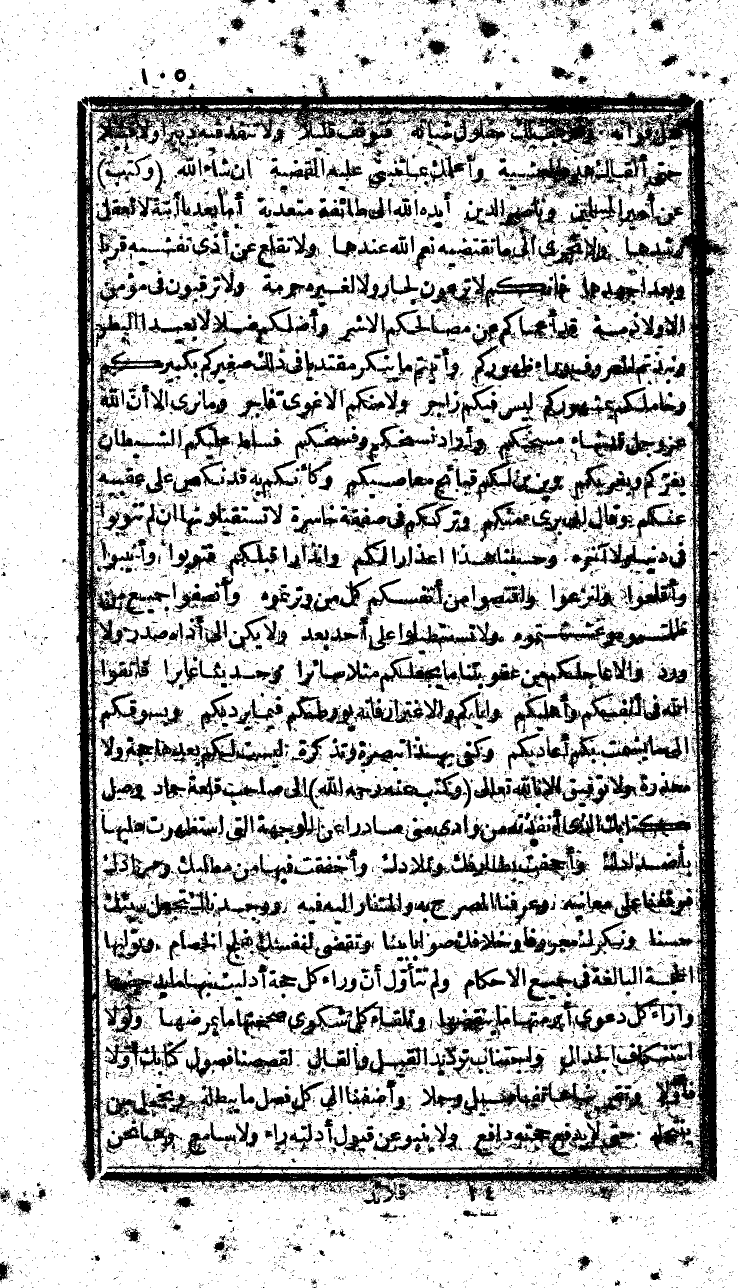 وتقوم وتقعد، وتبرق غيظاً وترعد، وتستدعي ذؤابات العرب، وصعاليكهم من مبتعد ومقترب، فتعطيهم ما ف خزانتك جزافاً، وتنفق عليهم كنزه أوائلك إسرافاً، وتمنح أهل العشرات مئين وأهل المئين ألافاً، كل ذلك لتعضد بهم، وتعتمد على تعصبهم، وتعتقد أنهم جنتك من المحاذير، وحماتك من المقادير، وتذهل عما في الغيب من أحكام العزيز القدير، وكتب عنه رحمه الله إلى أهل مكناسة، أما بعد أصلح الله من أعمالكم ما اختل، واصح
