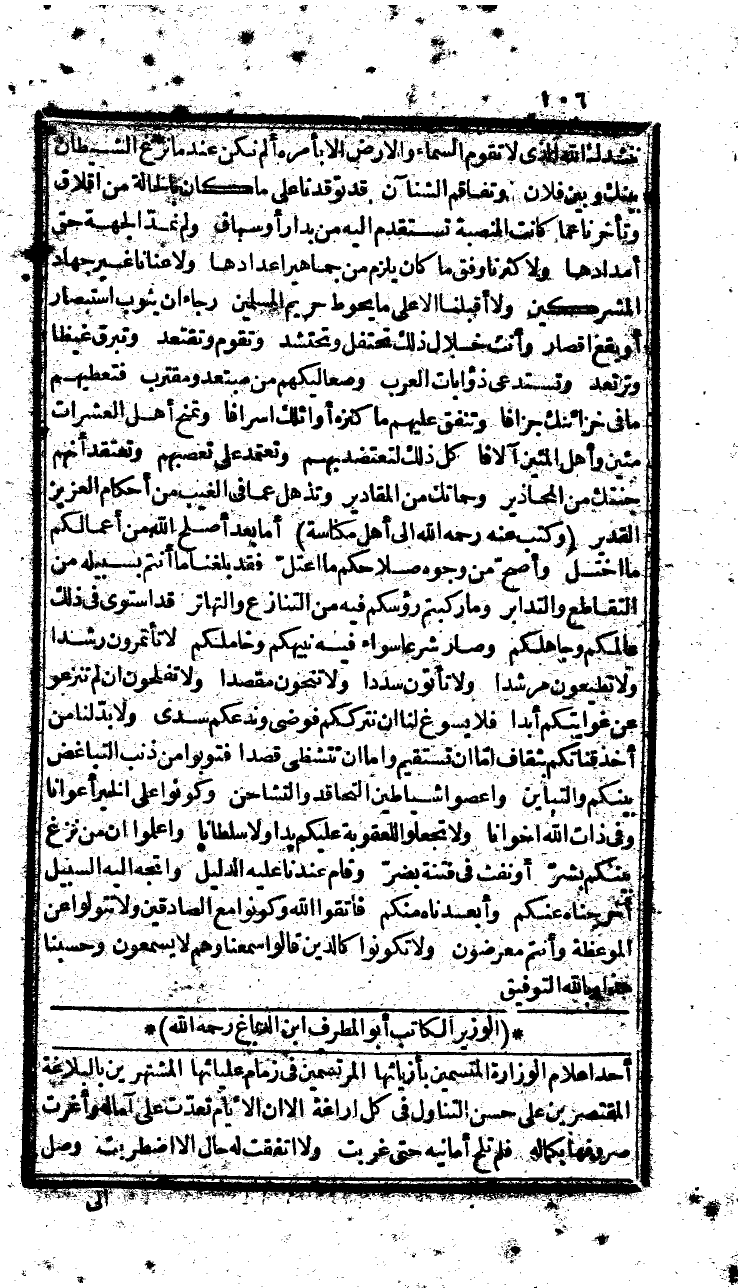 من وجوه صلاحكم ما اعتل، فقد بلغنا ما أنتم بسبيله من التقاطع والتدابر، وما ركبتم رؤوسكم فيه من التنازع والتهاتر، وقد استوى في ذلك عالمكم وجاهلكم، وصار شرعاً سواء فيه نبيهكم وخاملكم، ولا تأتمرون رشداً، ولا تطيعون مرشدا، ولا تأتون سددا، ولا تنحون مقصدا ولا تفلحون إن لم تنزعوا عن غوايتكم أبداً، فلا يسوغ لنا أن نترككم فوضى وندعكم سدى، ولابد لنا من أخذ قناتكم بثقاف أما أن تستقيم أو تتشظى قصداً، فتوبوا من ذنب التباغض بينكم والتباين، واهصوا شياطين التحاقد والتشاحن، وكونوا على الخير أعوانا، وفي ذات الله أخوانا، ولا تجعلوا لعقوبة عليكم يدا ولا سلطانا، واعلموا أن من نزغ بينكم بشر، أو نفث في فتنة بضر، وقلم عندنا عليه الدليل، واتجه إليه السبيل، وأخرجناه عنكم، وأبعدناه منكم، فاتقوا الله وكونوا مع الصادقين ولا تتولوا عن الموعظة وأنتم معرضون، ولا تكونوا كالذين قالوا سمعنا وهم لا يسمعون، وحسبن هذا وبالله التوفيق.