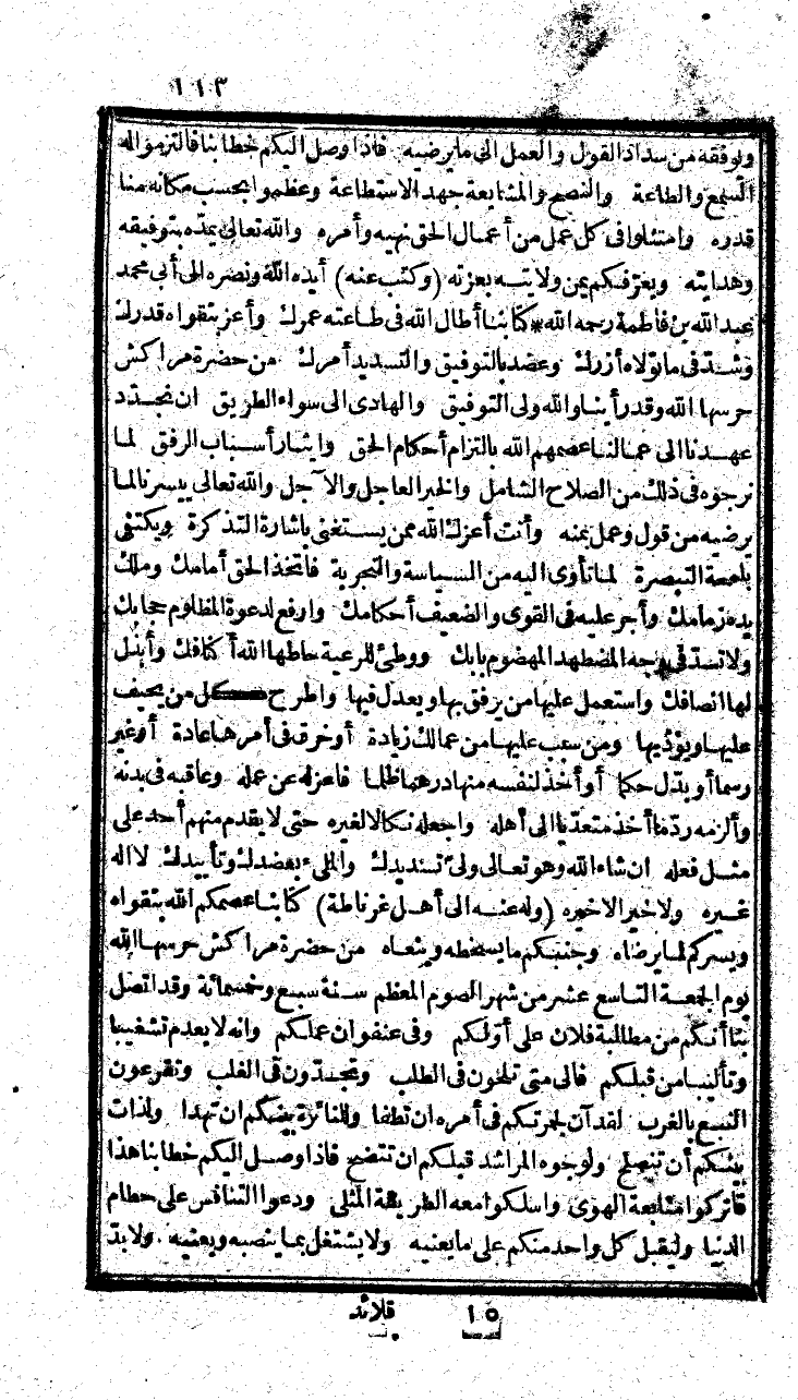 وإيثار أسباب الرفق لما نرجوه في ذلك من الصلاح الشامل، والخير العاجل والأجل، والله تعالى ييسرنا لما يرضيه من قول وعمل بمنه، وأنت أعزك اله ممن يستغنى بإشارة التذكرة، ويكتفي بلمحة التبصرة، ولما تأوى إليه من السياسة والتجربة، اتخذ الحق أمامك، وملك يده زمانك، وأجر عليه في القوي والضعيف أحكامك، وارفع لدعوة حجابك، ولا تسد في وجه المضطهد المظلوم بابك، ووطئ للرعية حاطها الله أكنافك، وأبذل لها أنصافك واستعمل عليها من يرفق بها ويعدل فيها، واطرح كل من يحيف عليها ويوذيها، ومن سبب عليها من عمالك زيادة، أو خرق لا في أمرها عادة، أو غير رسما، أو بدل حكما، أو أخذ لنفسه منها درهما ظلما، فاعزله من علمه، وعاقبه في نده، والزمه رد ما أخذ تعديا إلى أهله، واجعله نكالاً لغيره فاعزله عن عمله، وعاقبه في ندنه، والزمه رد ما أخذ تعديا إلى أهله، واجعله نكالاً لغيره حتى لا قدم منهم أحد على مثل عله، إن شاء الله وهو تعالى ولي تسديدك، والملي بعضدك وتأييدك لا إله غيره، وله عنه إلى أهل غرناطة، كتابنا عصمكم الله بتقواه، ويسركم لما يرضاه وجنبكم ما يسخطه وينعاه، ومن حضرة مراكش حرسها لله يوم الجمعة التاسع عشر من شهر الصوم المعظم سنة سبع وخمساية وقد اتصل بنا أنكم من مطالبة فلان على أولكم، وفي عنفوان عملكم، وأنه لا يعدم تشغيباً وتأليباً من قبلكم، فإلى متى تلحون في الطلب، وتجدون في الغلب، وتقرعون النبع بالغرب، لقد آن حركتكم في أمره أن تهدي، وللنائرة بينكم أن تطفي، ولذات بينكم أن تصلح، ولوجوه المراشد قبلكم أن تضح، وإذا وصل إليكم خطابنا هذا فاتركوه متابعة الهوى، واسلكوا معه الطريقة المثلى، ودعوا التنافس على حطام الدنيا، وليقبل كل واحد منكم على ما يعنيه، ولا يشتغل بما ينصبه ويعنيه، لابد لكل عمل، من أجل ولكل ولاية، ومن غاية، ولن يسبق شيء أناه، وإذا أراد الله أمرا سناه، وعسى أن تكرهوا شيئاً وهو خير لكم والله يعلم وأنتم لا تعلمون، وفقكم الله لما فيه صون أديانكم وأعراضكم، وتسديد أنحائكم وأغراضكم بمنه، وكتب أعزه الله مرحبا بك أيها البر الفاتح، والروض النافح، فما أحسن تويجك، وأعطر تارجك، لقد تحت بالمخاطبة بابا، طالما كنت له هيابا، ورعت حجابا، وترك قلبي وجابا، وما زلت أحوم عليه شرعة، وفلا أسيغ منها جرعة، وأغازلها أملاً، فلا أطيقها عملاً، وألاحظها أمدا، أذوب دونها كمدا، وفي تعب