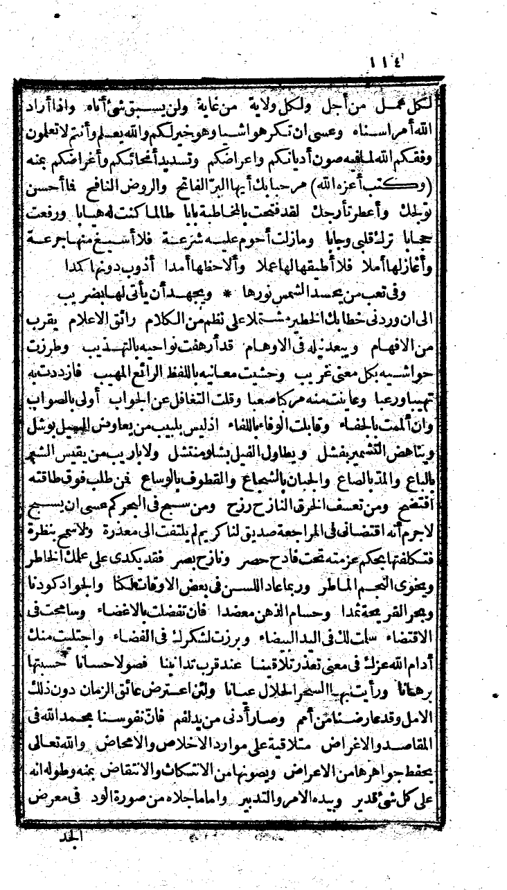 ولا باريب من قيس الشبر بالبارع، والمد بالصاع، والجبان بالشجاع، والقطوف بالوساع، فمن طلب فوق طاقته افتضح، ومن تعسف الخرق النازح رزح، ومن سبح ف البحر كم عسى أن يسبح، ولا جرم أنه اقتضاني في المراجعة صديق لنا كريم لم لتت إلى معذرة، ولا سمح بنظرة، فتكلفتها بحكم عزمته وتحت فادح حصر، ونازح بصر، فقد يكدي على علمك الخاطر، ويحوي النجم الماطر، وربما عاد اللسن في بعض الأوقات لكنا، والجواد كودنا، وبحر القريحة ثمدا، وحسام الذهن معضدا، فإن تفضلت بالأعضاء، سامحت في الاقتضاء، وسلمت لك في اليد البيضاء، وبرزت لشكرك في الفضاء، واجتليت منك أدام الله عزك ف معنى تعذر تلاقينا، عند قرب تدانينا، فصولاً حساناً حسبتها برهانا، ورأيت بها السحر الحلال عيانا، ولئن اعترض عائق الزمان دون ذلك الأمل وقد عارضنا من أمم، وصار أدنى من يد لفم، فإن نفوسنا بحمد الله في المقاصد والأغراض، متلاقية على موارد الإخلاص ولا محاض، والله تعالى بحفظ جواهرها من الأرض، ويصونها من الانتكاث والانتفاض، بمنه وطوله أنه على كل شيء قدير، وبيده الأمر والتدبير، وأما ما جلاه من صورة الود، في معرض الجد، وفقد ثوى بين الجوانح محلاً، لا يسوم الدهر عقده حلا، ولا يزال جفني ف رعيه مسهدا، وقلبي لصونه ممهداً، إن شاء الله واقرأ عليك يا سيدي المعظم في خلدي ساماً شريف النصاب، كريم الإحساب، والسلام الأتم الدعم، ما طلعت الأنجم وتضوع المسك الأحم، على سيدي الأعظم، ورحمة الله وبركاته.