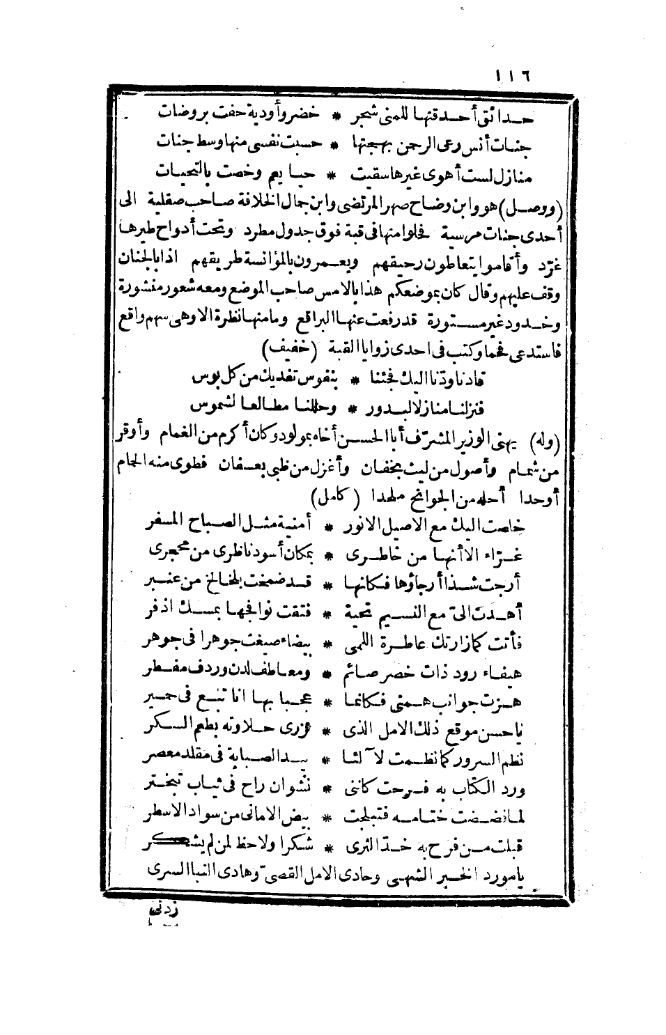 غرد، وأقاموا يتعاطون رحيقهم، ويعمرون بالمؤانسة طريقهم، إذا بالجنان وقف عليهم وقل كان بموضعكم بالأمس صاحب الموضع ومعه شعور منشورة، وخدود غير مستورة، قد رفعت البراقع وما منها نظرة إلا وهي سهم واقع، فاستدعي فحما وكتب في إحدى زوايا القبة. خفيف