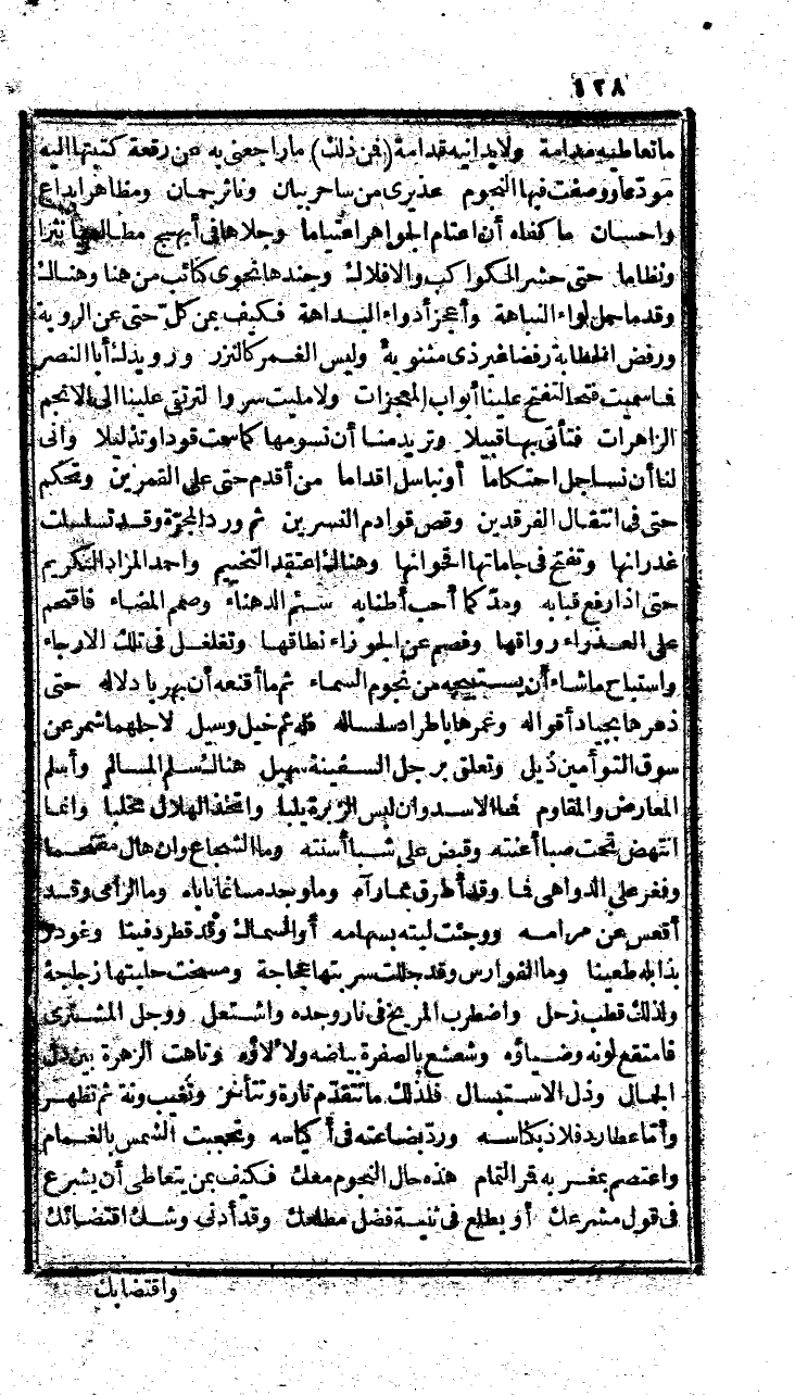 فتأتي بها قبيلا، وتريد منا أن نسومها كما سمت قوداً وتذليلا، وأنى لنا أن نساجل احتكاماً، وأن نباسل إقداماً، من أقدم حتى على القمرين، وتحكم حتى في انتقال الفرقدين، وقص قوادم النسرين، ثم ورد المجرة وقد تسللت غدرانها، وتفتح في جاماتها أقحوانها، وهناك اعتقد التخييم، وأحمد المراد الكريم، حتى إذا رفع قبابه، ومد كما أحب أطنابه، سئم الدهناء، وصمم المضاء، فاقتحم على العذراء رواقها، وفصم عن الجوزاء تطاقها، وتغلغل في تلك الأرجاء، واستباح من شاء أن يستبيحه من نجوم السماء، ثم أقنعه أن بهر بادلاله، حتى ذعرها بجياد أقواله، وغمرها بأطراد سلساله، فله ثم خيل وسيل، لأجلها شمر عن سوق التوءمين ذيل، وتعلق برجل السفينة سهيل، هناك سلم المسالم، وأسلم المعارض والمقاوم، فما الأسد وإن لبس البزة يلباً، واتخذ الهلال مخلباً، وإنما انتهض تحت صبا أعنته وقبض على شبا أسنته، وما لشجاع وإن هال مقتحماً، وفغر على الدواهي فما وقد أطرق مما رءاه، وما وجد مساغاً ناباه، وما الرامي وقد أقعص عن مرامه، ووجئت لبته بسهامه، أو لسماك وقد قطر دفينا، وغودر بذابله طعيناً، وما الفوارس وقد جللت سربتها عجاجة، ومسخت حلبتها زجاجة، ولذلك قطب زحل، واضطرب المريخ في نار وجد واشتعل، ووجل المشتري فامتقع لونه وضياؤه، وشعشع بالصفرة بياضه ولؤلؤه، وناهت الزهرة بين دل الجمال، وذل الاستبسال، فلذلك ما تتقدم تارة وتتأخر، وتغيب آونة ثم تظهر، وأما عطارد فلاذ بكناسه، ورد بضاعته في أكياسه، وتحجب الشمس بالغمام، واعتصم، بمغربه قمر التمام، هذه حال النجوم معك، فكيف بمن يتعاطى أن يشرع في قول مشرعك، أو يطلع في ثنية فضل مطلعك، وقد أدني وشك اقتضائ واقتضابك، وبعد من إغضابك فاعتمدت على إغضائك، فخذ السانح من عفوي، وتجاوز عن مقتي وصفوي، ثم متعني بفكري فقد رجع فليلاً، ودع لي ذهني عسى أن يتودع قليلاً، وأني وقد أصله من بينك الشغل الشاغل، وودعه من قربك الظل الزائل، ولا أنس بعدك ألا في تخيل معاهدك، وتذكر مصادرك النبيلة ومواردك، فسر في أمن السلامة محافظاً، وتوجه من ضمن الكرامة مشاهداً بالأوهام ملاحظاً، رعاك الله في حلك ومرتحلك، وقدمت على السني من متمناك والمرضي من أملك، بمن الله وفضله، واقرأ عليك