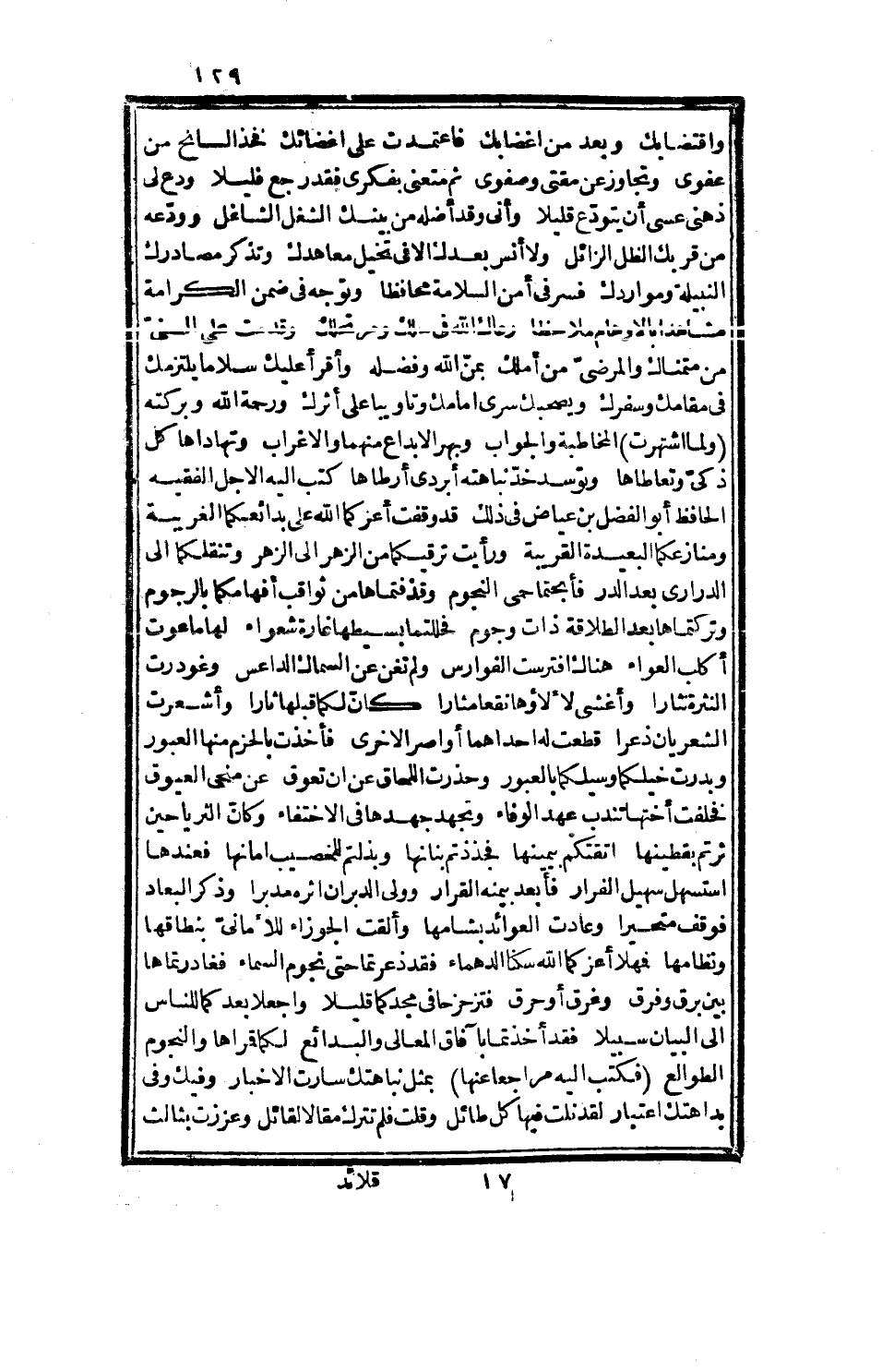 والإغراب، وتهاداها كل ذكي وتعاطاها، وتوسد خد نباهته ابردي ارطاها، كتب إليه الأجل الفقيه الحافظ أبو الفضل ابن عياض في ذلك، قد وقفت أعزكما الله على بدائعكما الغريبة، ومنازعكما البعيدة القريبة، ورأيت ترقيكما من الزهر إلى الزهر، وتنقلكما إلى الدراري بعد الدر، فاحتما حمى النجوم، وقذفتماها من ثواقب أفهامكما بالرجوم، وتركتماها بعد الطلاقة ذلت جوم، فحللتما بسيطها غارة شعواء، لها ما عوت أكلب العواء، هناك افترست الفوارس، ولم تغن عن السماك الداعس، وغودرت النثرة نثاراً، وأغشي لؤلؤها نقعاً مثارا، كان لكما قبلها ثارا، وأشعرت العشريان ذعراً، قطعت له إحداهما أواصر الأخرى، فأخذ بالحزم منها العبور، وبدرت خيلكما وسيلكما بالعبور، وحذرت اللحاق عن أن تعوق، عن منحنى العيوق، فخلفت أختها تندب عهد لوفاء، وتجهد جهدها في الاختفاء، وكأن الثريا حين ثرتم بقطينها، اتقتكم بيمينها، فجذذتم بنانها، وبذلتم للخصيب أمانها، فعندها استسهل سهيل الفرار، فأبعد بيمنه القرار، وولى الدبران أثره دبرا، وذكر البعاد فوقف متحيراً، وعادت العوائد بشامها، والقت الجوزاء للأماني بنطاقها ونظامها، فمهلاً أعزكما الله سكنا الدهماء، فقد ذعرتما حتى نجوم السماء، فغادرتماها بين برق وفرق، وغرق أو حرق، فتزحزحا في مجدكما قليلاً، واجعلا بعدكما للناس إلى البيان سبيلا، فقد أخذتما بآفاق المعالي والبدائع، لكما قمراها والنجوم الطوالع، فكتب إليه مرجعاً عنها، بمثل نباهتك سارت الأخبار، وفيك وفي بداهتك اعتبار، لقد نلت فيها كل طائل، وقلت فلم تترك مقالاً لقائل، وعززت بثالث هو الجميع، وبرزت فأين من شارك الصاحب والبديع، جلاء بيان، في خفاء معان، هذا أثب للسهى جلالاً، وأشاد فيه لذوي النهى أمثالاً، وذاك رفع للأقمار لواء، والقى على شمس النهار بهجة وضياء، أقسم بسبقك، ومقدم حقك، لئن أفحمت بما نطقت، لقد أفهمت عن أي صبوح رفقت، ومهما أبهمت تفسيراً، فدونك منه شيئاً يسيراً، لما اعتمدنا نحن ذلك المظهر، فما أبعدنا هناك الأثر، بل اقتصدنا على الأصعاد، وقدنا في تلك النيرات كل سلس القياد، حتى إذا اشماز طلقها، فعز أبلقها، وصبحنا