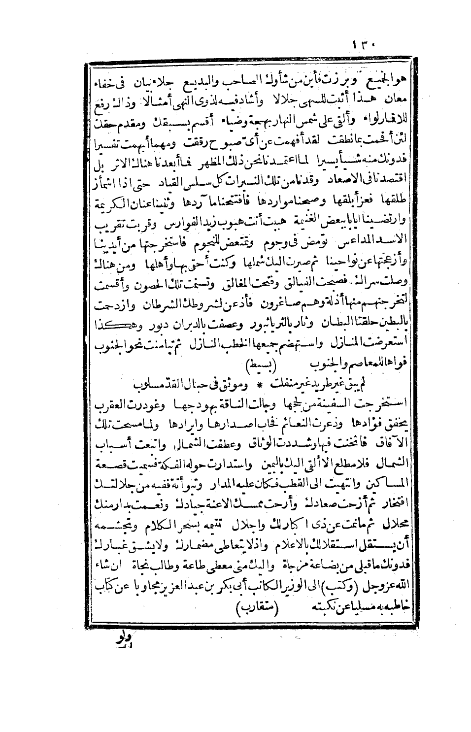 مواردها، فافتتحنا ماردها، وثنينا عنان الكريمة، وارتضينا إياباً ببعض الغنيمة، هببت أنت هبوب زيد الفوارس، وقربت تقريب الأسد المداعس، تومض في وجوم، وتمتعض للنجوم، فاستخرجها من أيدينا، وأزعحتها عن نواحينا، ثم صيرت إليك شملها، وكنت أحق بها وأهلها، ومن هناك، وصلت سراك، فصبحت الفيالق، وفتحت المغالق، وتسنمت تلك الحصون، أقسمت لتخرجنهم من أذلة وهم صاغرون، فاذعن لشروطك الشرطان، وازدحمت بالبطين حلقتا البطان، وثار بالثريا ثبور، وعصفت بالدبران دبور، وهكذا استعرضت المنازل، واستهظم جميعها الخطب النازل، ثم تيامنت نحو الجنوب، فواها للمعاصم والجنوب، بسيط