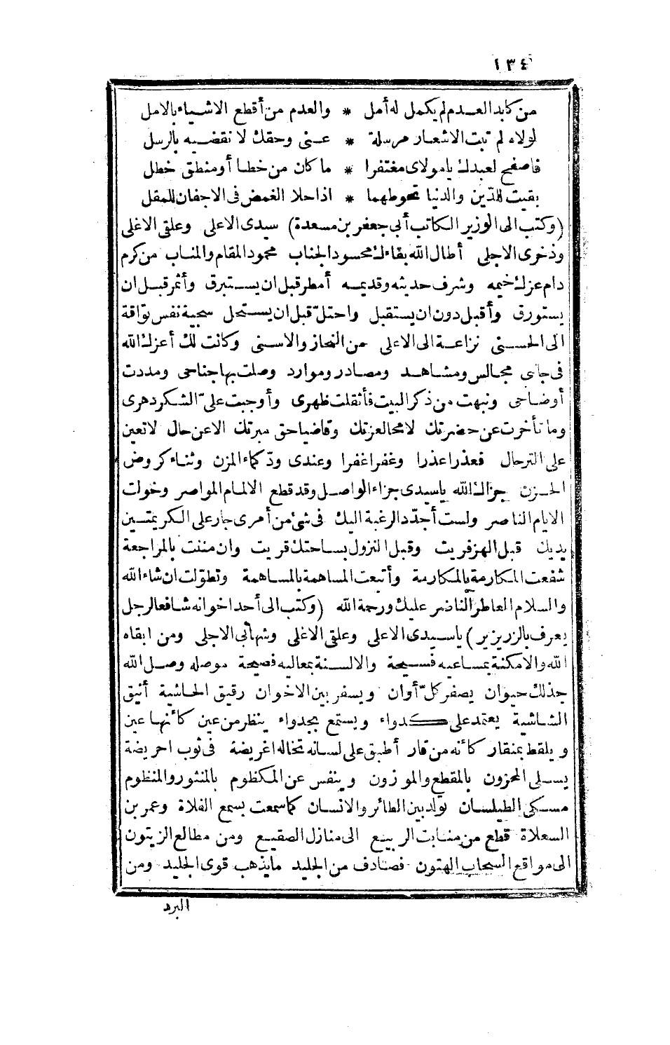 عزك خيمه، وشرف حديثه وقديمه، أمط قبل أن يستبرق، وأثمر قبل أن يستورق، وأقبل دون أن يستقبل، واحتل قبل أن يستحل، سجية نفس تواقة إلى الحسنى، نزاعة إلى الأعلى، من النحار والأسنى، وكانت لك أعزك الله في جانبي مجالس ومشاهد، ومصادر وموارد، وصلت بها جناحي، مددت أوضاحي، ونبهت من ذكري البيت فأثقلت ظهري، وأوجبت علي الشكر دهري، وما تأخرت عن حضرتك لامحا لعزتك، وقاضياً حق مبرتك، ألا عن حال، لا تعين على الترحال، فعذرا عذرا، وغفرا غفرا، وعندي ود كماء المزن، وثناء كروض الحزن، جزاك الله يا سيدي جزاء الواصل وقد قطع الإلمام المواصر، وقد خولت الأيام الناصر، ولست أجدد الرغبة إليك، في شيء من أمري جار على الكريمتين يديك، قبل الهزفريت، وقبل النزول بساحتك قريت، وإن مننت بالمراجعة شفعت المكارمة بالمكارمة، واتبعت المساهمة بالمساهمة، وتطولت إن شاء الله، والسلام العاطر الناضر عليك ورحمة الله، وكتب إلى أحد إخوانه شافعاً لرجل يعرف بالزريزير، يا سيدي الأعلى، وعلقي الأغلى، وشهابي الأجلى، ومن أبقاه الله والأمكنة بمساعيه فسيحة، والألسنة بمعاليه فصيحة، موصله وصل الله جذلك حيوان، يصفر كل أوان، ويسفر بين الإخوان، رقيق الحاشية، أنيق الشاشية، يعتمد على كدواء، ويستمع بجدواء، ينظر من عين، كأنها عين، ويلقط بمنقار، كأنه من قار، أطبق على لسانه تخاله أغريضة، في ثوب أحريضة، يسلي المحزون، بالمقطع والموزون، ينفس عن المكظوم، بالمنثور والمنظوم، مسكي الطيلسان، تولد بين الطائر والإنسان، كما سمعت بسمع الفلاة، وعمر ابن السعلاة، قطع من منابت الربيع، إلى منازل الصقيع، ومن مطالع الزيتون، إلى مواقع السحاب الهتون، فصادف من الجليد، ما يذهب قوى الجليد، ومن البرد، ما لا يدفعه ريش ولا برد، والحدائق قد أغمضت أحداقها، وانحسرت أوراقها، والبطاح قد قيدت الفور، بحبائل الكافور، وأرقعت الصرد، فمني البائس بما لم يعهده، كما وسم بالزرزور ولم يشهده، ولما فال رأيه وأخفق أو كاد سعيه التفت إلى عطفة أشمط، وإلى أديمه أرقط، فناح، ثم سوى الجناح، وقد نكر مزاجه، ونسي ألحانه وأهزاجه، ولا شك أنه واقع بفنائك، وراشف من إنائك، أمل حسن غنائك واعتنائك، وأنت بارق ذلك العارض، ورائد ذلك الأنف البارض،