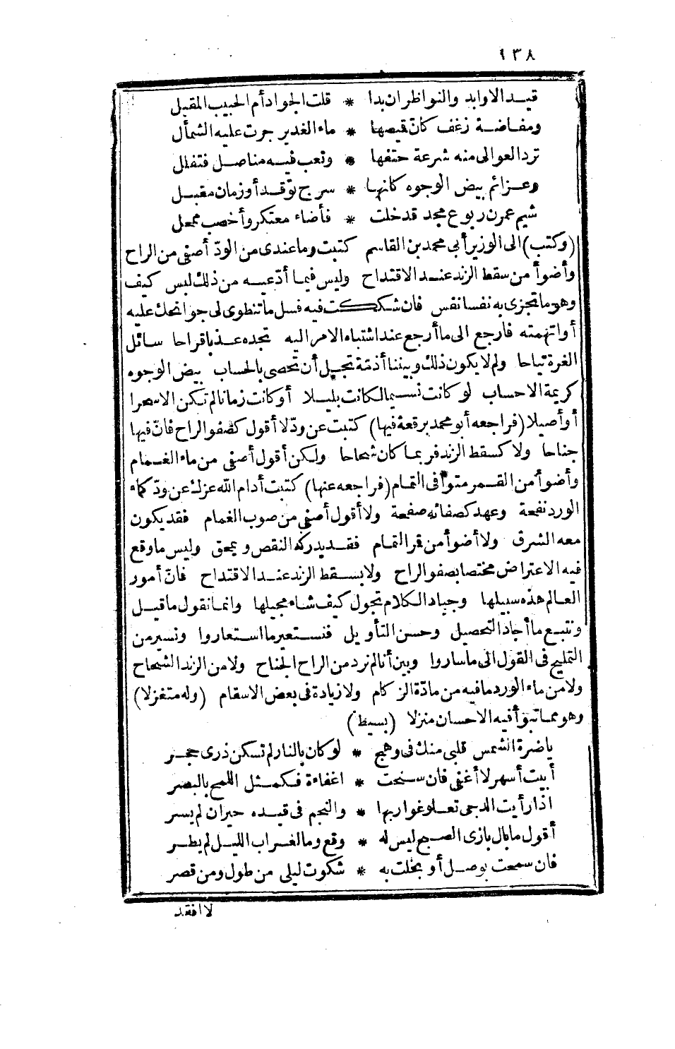كيف وهو ما تجزي به نفسا نفس، فإن شككت فيه فسل ما تنطوي لي جوائحك عليه، أو اتهمته فارجع إلى ما أرجع عند اشتباه الأمر إليه، تجده عذبا قراحاً، سائل الغرة تياجاً، ولك لا يكون ذلك وبيننا ذمة تجل أن تحصى بالحساب، بيض الوجوه كريمة الأحساب، لو كانت نسيماً لكانت بليلاً، أو كانت زماناً لم تكن إلا سحراً أو أصيلا، فراجعه أبو محمد برقعة فيها، كتبت عن ود لا أقول كصفو الراح فإن فيها جناحاً، ولا كسقط الزند فربما كان شحاحاً، ولكن أقول أصفى من ماء الغمام، وأضوأ من قمر متوافي التمام، فراجعه عنها،، كتبت دام عزك عن ود كماء الورد نفحة، وعهد كصفائه صفحة، ولا أقول أصفى من صوب الغمام، فقد يكون معه الشرق، ولا أضوأ من قمر التمام، فقد يدركه النقص ويمحق، وليس ما وقع فيه الاعتراض مختصاً بصفو الراح، ولا بسقط الزند عند الاقتداح، فإن أمور العالم هذه سبيلها، وجياد الكلام كيف شاء مجيلها، وإنما نقول ما قيل، ونتبع ما أجاد التحصيل، وحسن التأويل، فنستعير ما استعاروا، ونسير من التلميح في القول إلى ما ساروا، وبين أنا لم نرد من الراح الجناح، ولا من الزند الشحاح، ولا من ماء الورد ما فيه من مادة الزكام، ولا زيادة في بعض الأسقام، وله متغزلاً، وهو مما تبوأ فيه الإحسان منزلا، بسيط