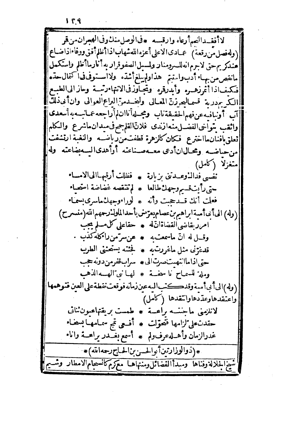 عما نبه به أسعدي، وأثقب بتواخي الفضل منه أزندي، فلان القلم جمح في ميدان ما شرع، والكلم تعلق بأفنان من اخترع، فكان كالزهرة قطفت من رياضه، والنبغة ارتشفت من حياضه، ومحال أن أدعي معه صناعته، وأهدي إليه بضاعته، وله متغزلا، كامل