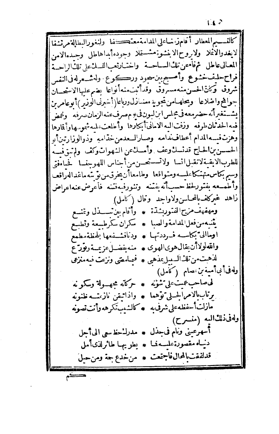 طرفه، وزفت إليه الأماني أبكارها، وأطلعت عليه شموسها وأقمارها، وهزت فيه المدام أعطاف ندامه، وصار السعد من خدامه، وذو الوزارتين أبو الحسن قد نسك وعف، وأمسك عن الشهوات وكف، ولم تبق فيه للطرب إلا بقية لا تقبل إنسا، ولا تستحسن من أجناس اللهو جنسا (فحيّاه) فتى وسيم بكاس منهتكا عليه ومتواقعا، وطامعا أن يخرق من توبته ما غدا له راقعا، وأطمعه بفتور لحظ حسب أنه يفتنه، وتثور فيه فتنه، فأعرض عنه إعراض زاد، فير كلفٍ بالمحاسن ولا واجد، وقال: كامل