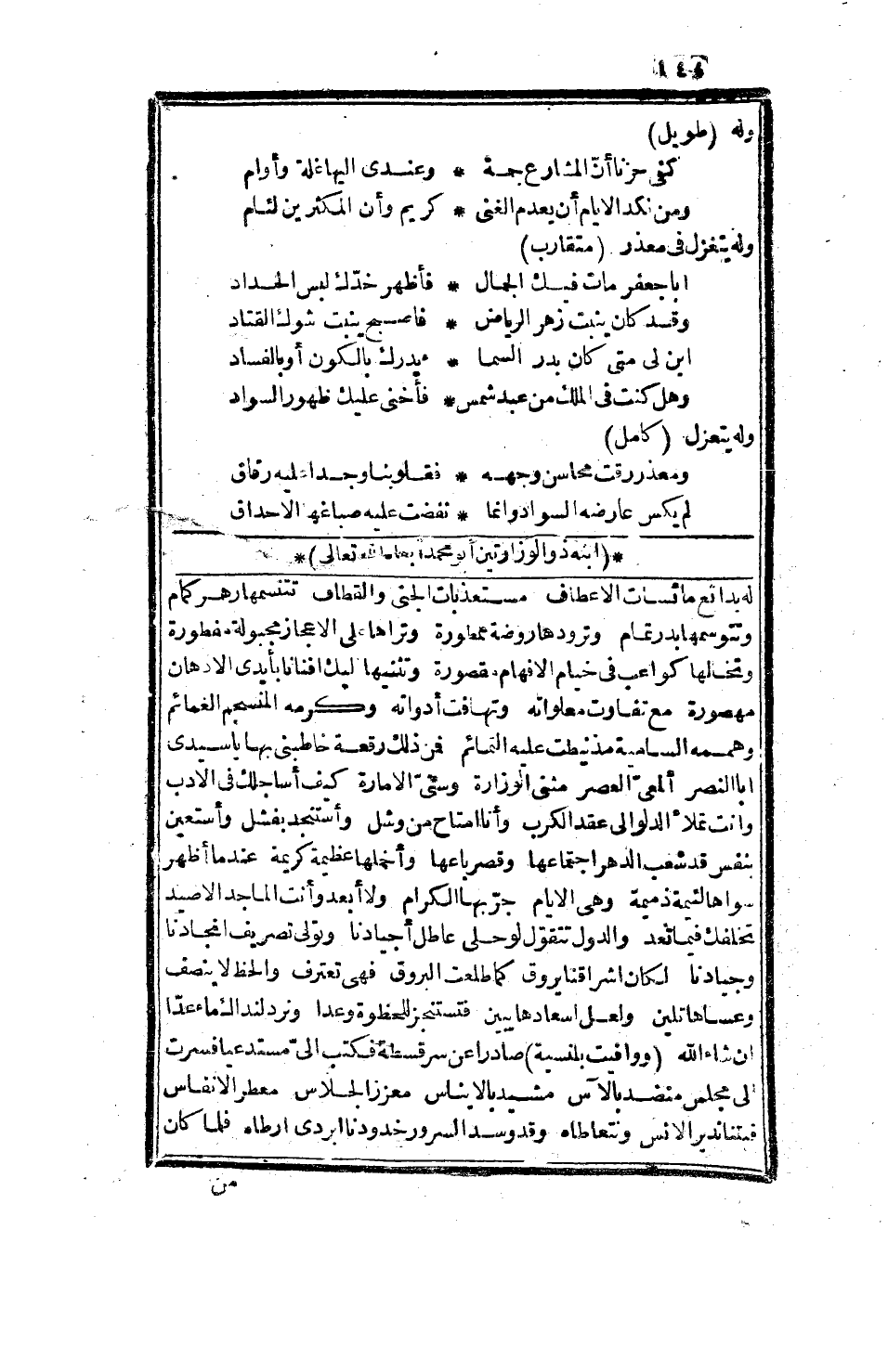 له بدائع مائسات الأعطاف، مستعذبات الجنى والقطاف، تتنسمها زهر كمام، وتتوسمها بدر تمام، وترودها روضة ممطورة، وتراها على الأحجاز مجبولة مفطورة، وتخالها كواعب في خيام الأفهام مقصورة، وتثنيها إليك أفناناً بأيدي الأذهان مهصورة، مع تفاوت معلواته، وتهافت أدواته، وكرمه المنسجم الغمائم، وهممه السامية مذ نيطت عليه التمائم، فمن ذلك رقعة خاطبني بها، يا سيدي أبا النصر، المعي العصر مثني الوزارة، وسنّي الإمارة، كيف أساجلك في الأدب، وأنت تملأ الدلو إلى عقد الكرب، وأنا أمتاح من وشل، وأستنجد بفشل، وأستعين بنفس شعب الدهر اجتماعها، وقصر باعها، وأخملها عظيمة كريمة، عندما أظهر سواها لئيمة ذميمة، وهي الأيام، حربها الكرام، ولا أبعد، وأنت الماجد الأصيد، تخلفك في ما تعد، والدول تتقوّل لو حلّى عاطل أجيادنا، وتولى تصريف أنجادنا وجيادنا، لكان إشراقنا يروق، كما طلعت البروق، فهي تعترف، والحظ لا ينصف، وعساها تلين، ولعلّ إسعادها يبين، فنستنجز للحظوة وعدا، ونرد لنداك ماء عدا، إن شاء الله، ووافيت بلنسية صادرا عن سرقسطة فكتب إليّ مستدعياً فسرت إلى مجلس منضّد بالآس، مشيّد بالإيناس، معزّز الجلاّس، معطّر الأنفاس، فبتنا ندير الأنس ونتعاطاه، وقد وسد السرور خدودنا أبردي أرطاه، فلما كان من الغد كتب إليّ. واحدي أبا النصر مثني الوزارة كيف أستسقي لموضع احتلالك، وحسبه صوب نوالك، وأمتري الغمام لمنازلك، وكفاها فيض أناملك، ترسل من نوافلها دررا، وتنظم في لبّات الزمان من محاسنها دررا، قسما لولا وقفة، حنّت عليها من وداعك عطفة، انتهزتها مولعاً بحلال صبّا، وقد يوخد العلق الممنّع غصبا، ما لاح للأنس علم، ولا سكن لنواك ألم، فإنّما ألمعت بساعات قربك إلماعا، ملأت بها عيوناً وأسماعا، ومددت فيها للأدب والبحث باعاً وساعا، لم تمتع بحظّها حتى جعلت تسليمها وداعا، فلئن رحلت فإنّ هذه نفوس تشيّع، وقلوب تذوب فتدمع، وما هي أبا نصر إلا بديهة خاطر، في التعرض لك مخاطر، أرجو لكفّ شباة نقدك، عنها فضل ودّك، ولمأمول أغضائك، باهر علائك، فلا زالت حلاك رائقة، وعلاك شائقة، إن شاء الله.