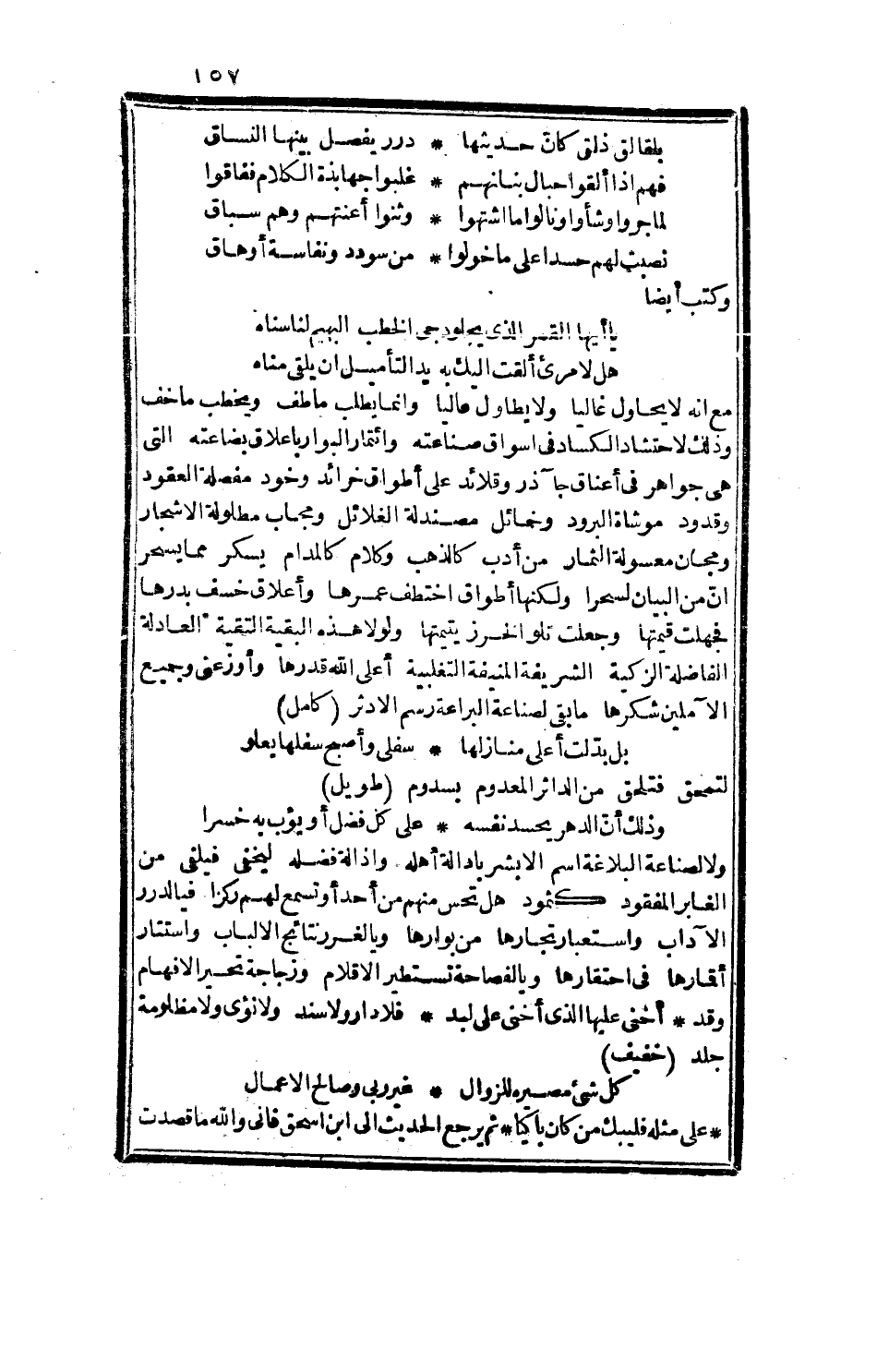 بعين بيانه لترحيب، ولئن كان ذلك، فلأحليّن ما هنالك، من سلف كريم، وشرف صميم، وهمم نفوس أبيّة، وشمم أنوف تغلبية، بشذور، منشور، هي الغناء المعبدي وعيون، موزون، هي السناء الأبدي. بسيط