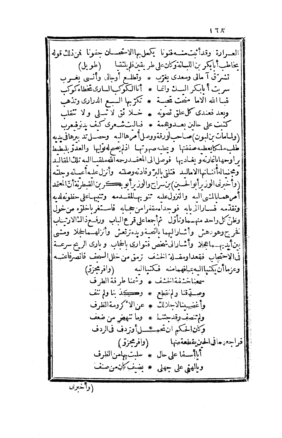 تباريه، فطار بجناح، وصار إلى بغيته دون جناح، فانتظروه ليسفر عنه العجاج، وتطلعه تلك الفجاج، فلم يروا إلا منهجه، ولا اقتضوا عوضاً منه إلا رهجه، فعلم أبو الحسين ما حثه، وأشاعه فيهم وبثه، فما أنصرفوا إلا وهلال رمضام لائح، وهو على راحة رائح، فكتب إليه أبو الحسين ابن سراج: كامل