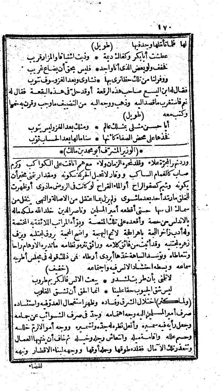مستعذب المقاطع، كأنما صور من نور ساطع، أبهى من محيا الظبي المخجل، وأحلى من الأمن عند الخائق الوجل، يهب عطرا نشره، ولا يغب حينا بشره، تجتليه بساما، وتنتضيه حساما، أن وأخاك أبرم عقد أخائه، وأعفاك من زهوة وانتخائه، ماء صفائه وارف يكاد يقطر، وسماء أحتقائه وأكفه أبدا تمطر، وله أدب لو نشر لكان بردا محبرا، أو تنسم لهب مسكا وعنبرا، وأما الخطابة ففي يده صار عناتها، وعليه وقف عناتها وقد أثبت من نظمه ونثره، ما ينظمه الزمان عقدا في نحره، فمن ذلك قوله يصف أيام أيناسه، وما كيف له الشباب من أنواع الوصل وأجناسه. متقارب