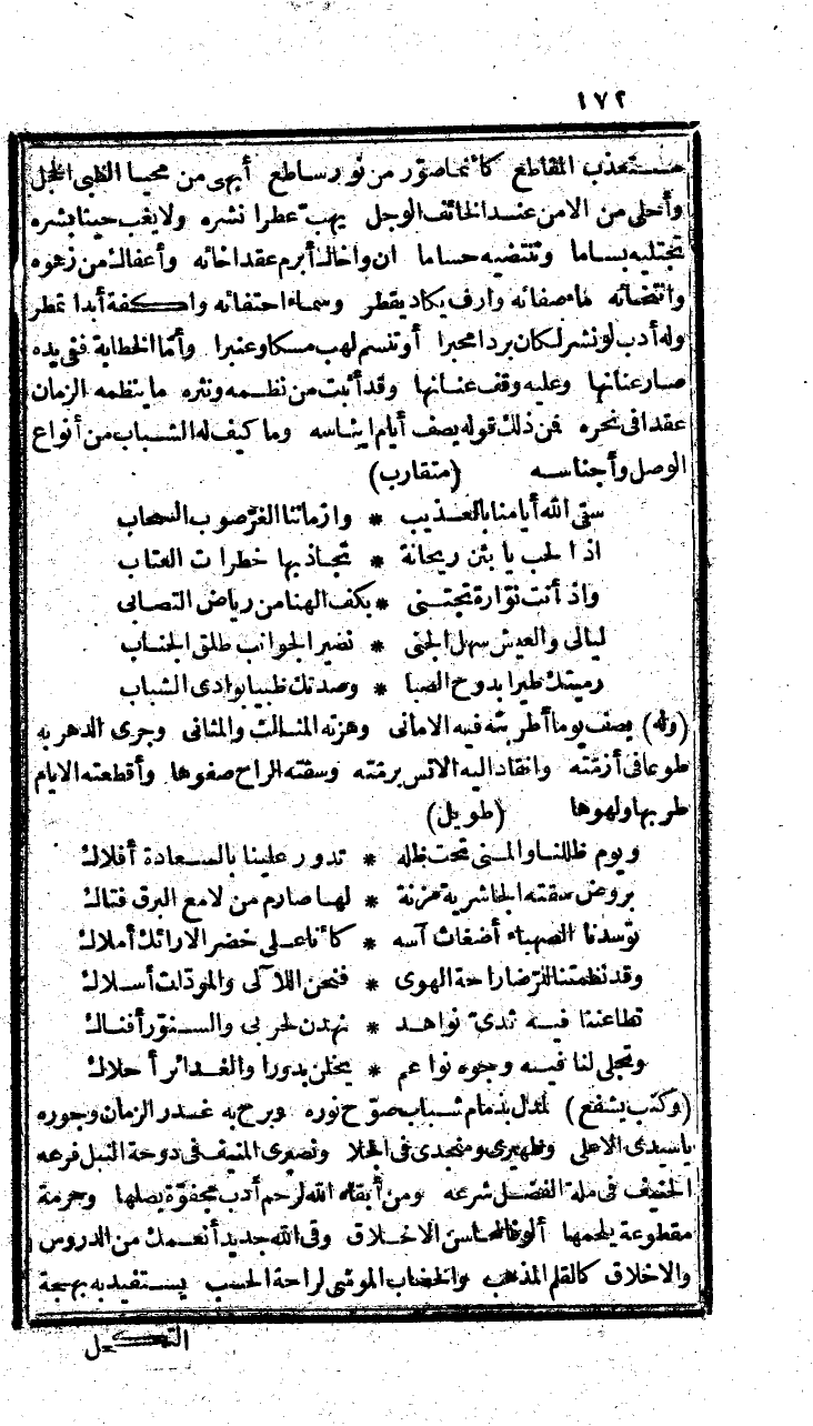 وموصله وصل الله سراءك، واثل علاءك، أبو فلان، ذاكر مشاهدك الغر الحسان، وناشر ما تعتمد في صلته من مقاصد الحسن والإحسان، أبقاه الله ما نظمني معه سمط ناد، ولا أحتواني وأياه مضمار شكر وأحماد، إلا وأثبت من ماثرك خليطي الدر والمرجان، وجاء بطليعة السوابق في إحصاء مفاخرك رخي اللبب مرخي العنان، ولقد فأوضني من أحاديت ايتلافكما في العصور الدارسة العافية، وانتظامكما في زهرات الأنس في ظلال العافية، واتساقكما في حبرات العيش الرقاق الضافية، وارتشافكما لسلافة النعيم المزة الصافية، بافانين الغيطان والنجود، وزخارف الروض المجود، ومعاطف الطرر بين خيلان الخدود، ما لو لقيت بشاشته الصخر لمنح بهجة الإيراق، ولو القيت عذوبته في البحر لأصبح حلو المذاق، لو رقى به البدر لوقي آفة المحاق، ولو مر ببيداء لعادت كسواد العراق، وأزمع أن يسير بنواعج، في طرقه ومناهجه، ويطير بجناح الارتياح في الدر، إلى متفاذف ذلك الجو، ليكحل بالتماحك جفونه، ويجلو باوضاحك دجونه، ويجدد بلقائك عهداً أنهج البين رسمه، ويشاهد بمشاهدة علائك سروراً محت يد البين وسمه، ويحط من أفناء بشرك بالأهل العامر، ويسقط من أنواء برك على الحافل الغامر، فخاطبت معرضاً عن التحريض، ومجتز يا بنبذ العرض ولمح التعريض، وتابعا له بإسرارك تلك الخطرات ذكر العهود القديمة، وارتياحك للقاء مثله من أعلاق العشرة الكريمة، وأنت ولي ما تتلقاه به من تأنيس ينشر ميت رجائه، ويعمر مقفرا أرجائه، لازلت عاطفاً على الأخلاء بكرم الود، قاطعاً زهر الثناء من كمام الحمد، بحول الله.