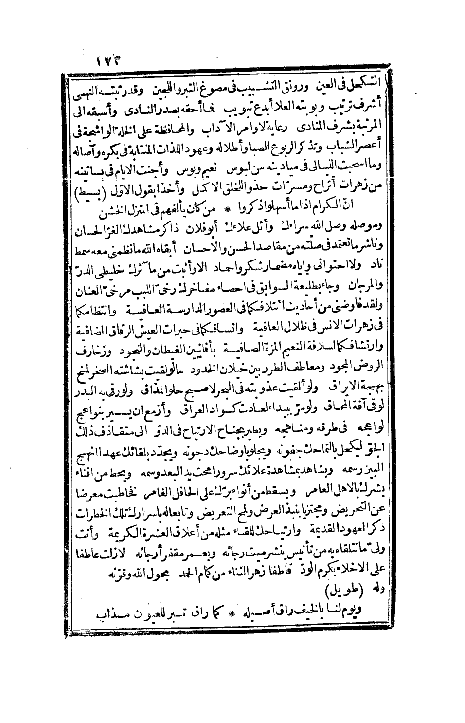 وحملنا الوزير القاضي أبو الحسن بن أضحى إلى إحدى ضياعه بخارج غرناطة ومعنا الوزير أبو محمد بن مالك، وجماعة من أعيان تلك المسالك، فحللنا بضيعة لم ينحت المحل أثلها، ولم ترمق العيون مثلها، وجلنا بها في أكناف، جنات الفاف، فما شئت من دوحة لفاء، وغصن يميس كعطفي هيفاء، وماء يناسب في جداوله، وزهر يضمخ بالمسك راحة متناوله، ولما قضينا من تلك الحدائق أربا، واقتضضنا منها أتراباً عربا، ملنا إلى موضع المقيل، وزلنا عن منارة تزري بمنارة جذيمة مع ملك وعقيل، وضد وصولنا بدا غلي من أحد الأصحاب تقصير في المبرة، عرض لي منه تكدير لتلك العين الثرة، فأظهرت التثاقيل أكثر ذلك اليوم، ثم عدلت عنهم إلى الأضطجاع والنوم، فما استيقظت إلا والسماء قد نسخ صحوها،