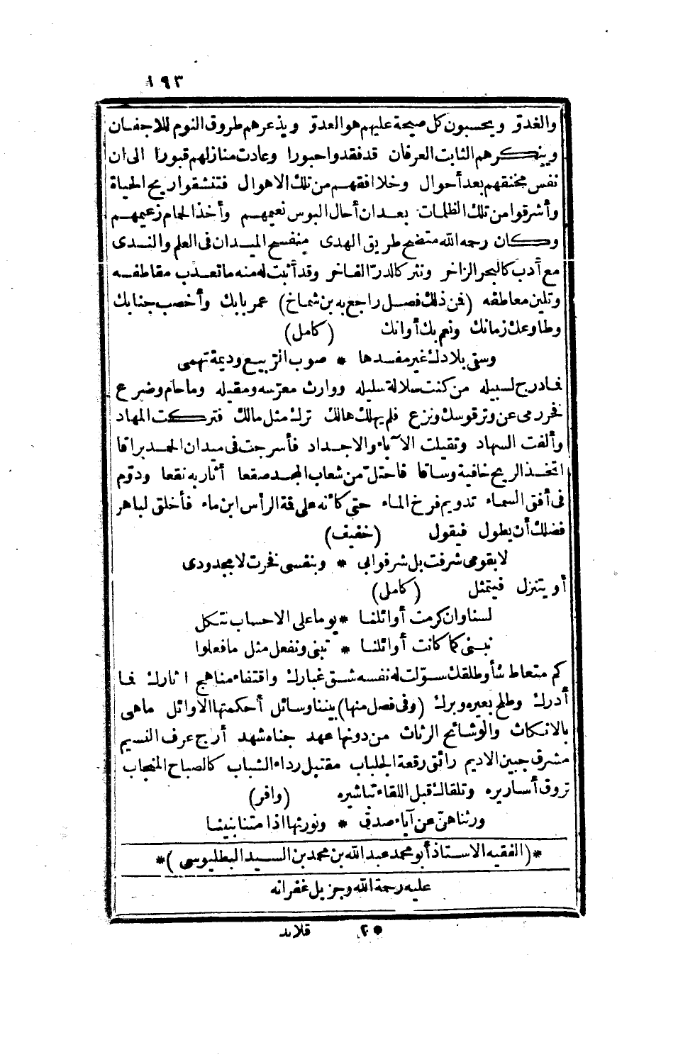 نفسه لأقراء علوم النحو، وقنع بتغييم جوة بعد الصحو، وله تحقق في العلوم الحديثة والقديمة، وتصرف في طرقها القويمة، ما خرج بمعرفتها عن مضمار شرع، ولا نكت عن أصل للسنة ولا فرع، وتوليفه في المشروحات وغيرها صنوف، وهي اليوم في الآذان شنوف، وقد أثبت له ما يريك شفوفه، وتجد على النفس خفوقه، فمن ذلك قوله في طول اليل: طويل