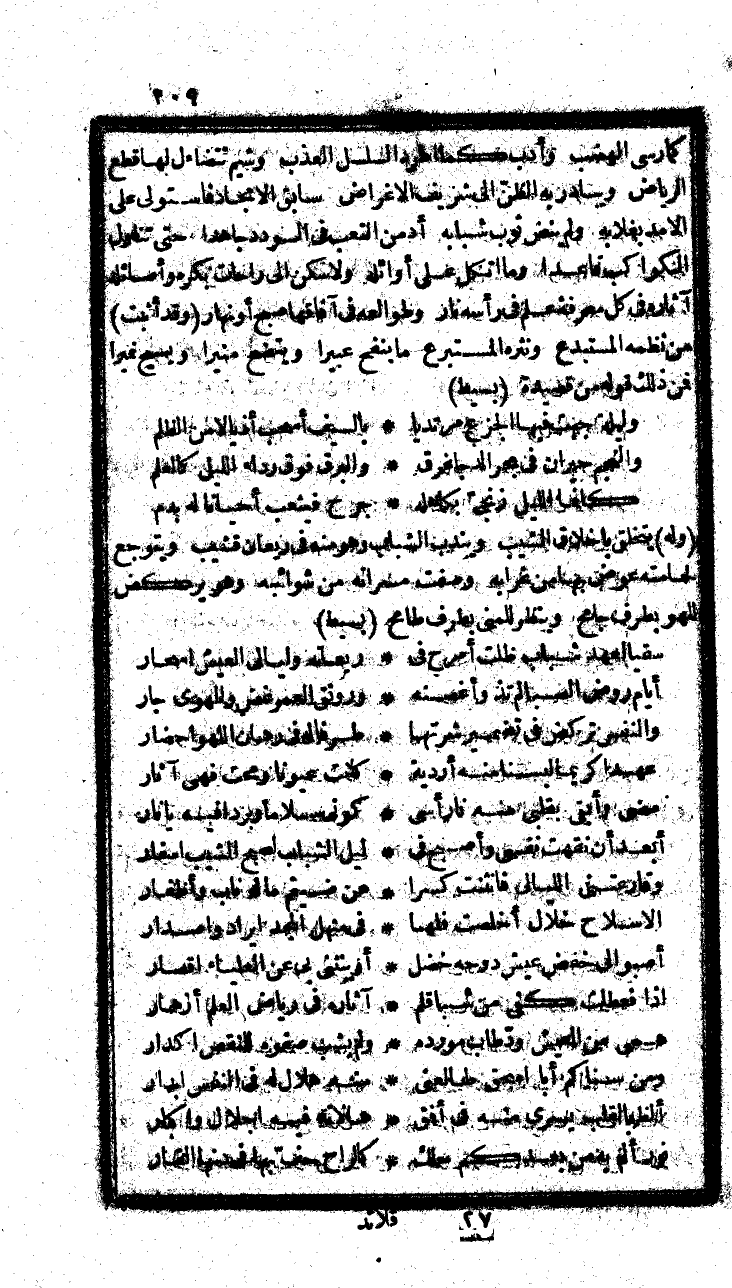 ومررنا في إحدى نزهنا بمكان مقفر، وعن المحاسن مسفر، وفيه برك نرجس كأنه عيون مراض، يسيل وسطه ماء رضراض، بحيث لا حس إلا للهام، ولا أنس إلا ما يتعرض للأوهام فقال: رمل