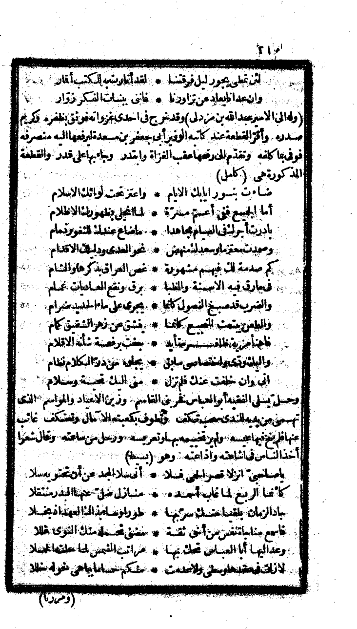 وكتب أعزه الله، يا سيدي الأعظم، وعمادي الأكرم ومعقلي الأعصم، ومن أطال الله بقاءه وائل علياءه وسناءه، ولا زال عميم المجد، كريم العهد، مراعيا حرمة ذي الخلوص والود، طارحا قذى المبطلين عن مشارب الصفا، مطيرا لحاء الغدر عن عود الوفاء، بعزة الله كتبته أدام الله عزك بعد أن وافاني كتابك الأكرم صحبة الفقيه الجليل أبي فلان اعزه الله فأول ما أقول في شكره الذي أفعم الأفق طيبا، واسمع الصم خطيبا، ورد فما زال يعيد ذكرك الأعطر، ويبدي وينثر أثناء الأحاديث حمدك الألزم وينشر، قضاء لحق المجد الذي لك سبقه وخلصه، وثناء بالذي أنت أهله، وذكر من تلك المكارم التي تحثو في وجه السحاب المجلب، والمنزل الذي كأنما كان على آل المهلب، ما أهب الألسنة بالدعاء، وغمر النفوس باريجة السراء، ثم تلاه لي دام عزك بم شاهده من مذهبك الأجمل، وصفائك الأول، واعتقادك في جهتي أن الوشاة أثنوا بالذي عابوا، وخابت سهامهم فما أصابوا، وهذه الأمور وصل الله توفيقك كما خبرت، وعلى ما جربت قديما وحديثا وسبرت، الغواة لا يتركون أديما صحيحا ولا يدرون في المعالي رأيا رجيحا، بل يتسنمون إلى ذوائب الشرف بالأذى، ويطرقون المشارب الزرق الجمام بالقذى، فإن ألفوا مهزا، وصادفوا لشفرة محزا، سدوا وصرخوا، بالفظاظة وهيمنوا، وأي حيلة أدام الله كرامتك في من يخلق ما يقول، وأني بالخلاص والسلامة شيء ما إليه سبيل، وما زلت مذ صبحت الأمجاد، وثافنت الحساد، أجعل هذه الأمور دبر الأذن، وأقنع لها بايلاء التجارب والفتن، علما بأن سري سيينه أطراد الإعلان، وأن قولي الغوي ستفضحه شواهد الامتحان، وبأواخر الأمور يقضى للأوائل، والله عز وجهه عند لسان كل قائل، ولو تتبعت كل وشاية بالتكذيب، وجبت كل نعيب وضغيب، لما اتسع لغير ذلك العمر، ولا استراح من وساوسه الفكر، وأنت وصل الله عزمك الملم بحفظ العهد، وجبر الأجر والقصد وعياذا أن يخفي للصوب بين عهدك الوفي، وظنك الألمعي، وتثبتك الشرعي، والله تعالى يعمر بالسدود ريعك، ويوسع لحمل المعالي وأعبائها ذرعك، ويجعل من كفايته ووقايته جنتك من الزمن ودرعك والسلام عليك ورحمة الله، وكتب إلى الأمير عبد الله