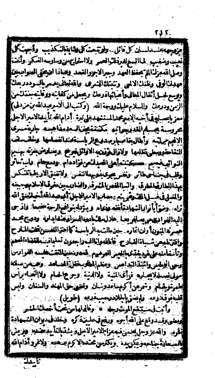 واثقب مع الوري زنودا، من أن يضعضع الؤريب لهضبة عزمك ركنا، أو يعمر الخطب الساحة حلمك مغنى، أو يقذف الدهر عليك بصرف، أو يبدع إلا بسجية وعزف، فالحيوة وان أرخى طولها فتياه باليد، والمرء وان جمح أمله هامة اليوم أو الغد وإنما ضربت أدام اله تأييدك هذه المثال، وان كدت أن لم يقبل وقال: وسددت هذه العبر، وأن جلبت التمر إلى هجر، حرصا على تسلية نفسك العزيزة عن طائف الهم، وتعزيتها عن حرة الملم، فأقصرها أيدك الله على العزاء وقفها، وأوردها مشرعة التاسي رفها، إلا ذيعتب لجازع الزمن، ولا يرد الفائت الحزن، والله عز وجل يلم بسعدك الشعث ويراب الشعب، ويضفي من رياستك الذوائب ويعلي الكعب، ويذيق الذين يضاهونك هونك، ويجعل الذين يحسدونك دونك، بعزته وصنع الله الأمير الأجل اجمل الصنع، ولما تلغب العدو على ميورقة كبته الله وجبرها، وتحققت الكافة خبرها، خاظب الفقيه أحد زعماء الدولة وادرج طي خطابه هذه المدرجة والشعر الموصول بها وأني أقر الله عينك لا تردد وقد قصر عن تململي السليم، واتجلد وفي نفسي المقعد المقيم، بهذا الصادم الهادم، والنبا القاصم، الذي أطفأ نور الحيوة وأخباه، وأوجب أن ينادي كل مومن وأحر قلباه، أمر ميورقة رأب الله بصرفها صدع الجزيرة، وجبر بجبرها من جناح الإسلام كسيره، وثقف بغوث دائها اضطراب مناده، وأعاد بتلافيها ما غيض من نصرة ومن أجلاده، فيالله لما كان فيها من إعلان توحيدها عاد همسا، ويوم إيمان آض أمسا، جي وبارقة كفر طلعت شمسا، وصباح شرع أظلم بداجي الشرك وأمسى ونجوم أصبح حرمها منتهبا، وفرقتها يد الغلبة أيدي سبا، وبخفرات أدال السياء صباحا، ولأوجه عفر منهم القتل سواعد وجباها، ومزقهم السيف كل ممزق، فله أرحام هناك تشفق، رحمهم الله ماتوا كرما، ولقاهم نظرة وسرورا وسلاما وختم لنا بعدهم بأحمد الخواتم، وأسندنا من أمره إلى عاصم. طويل