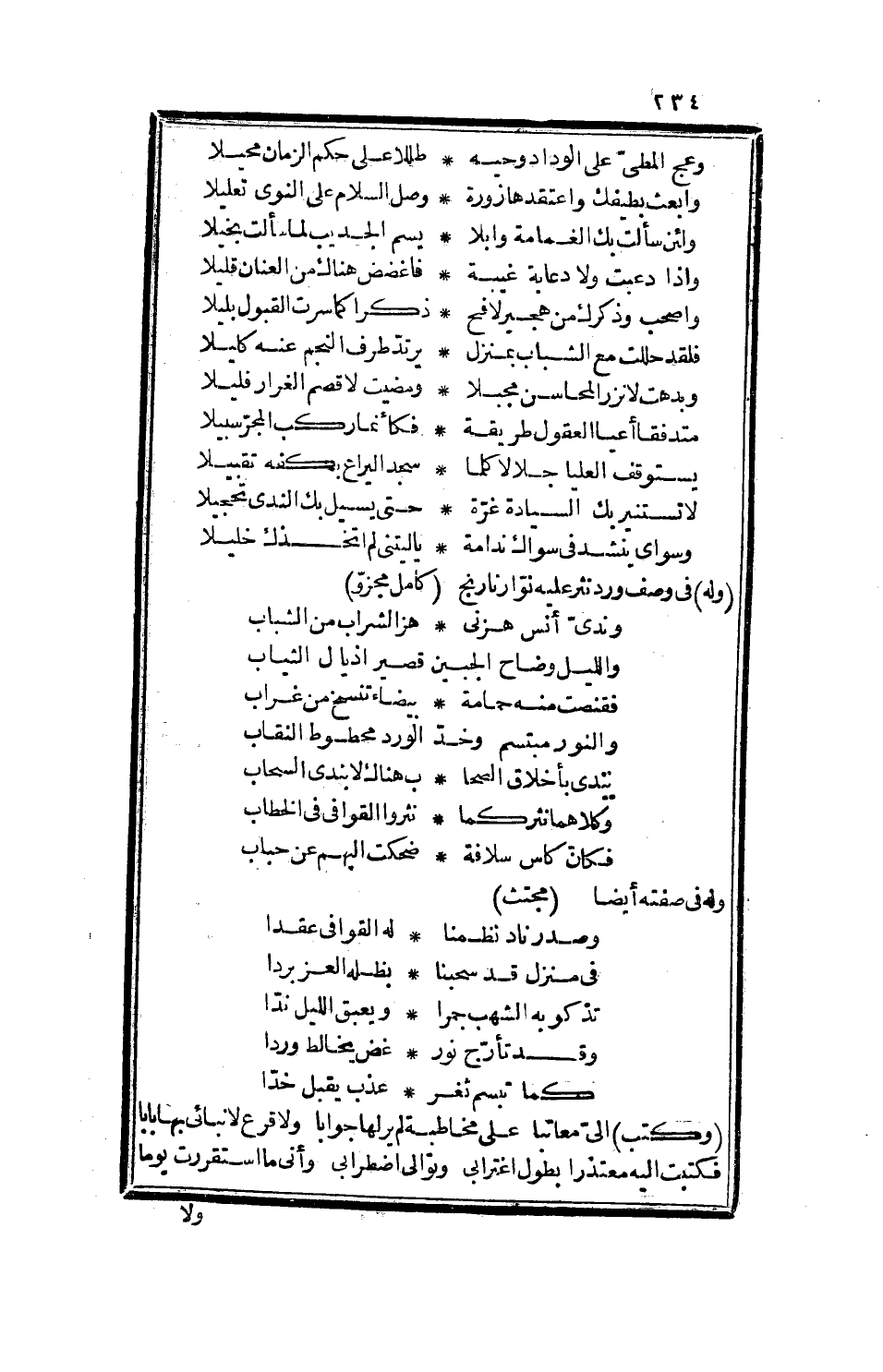 أجد الأرج مما، وأما وحقك قسما، يشتمل على الإيمان لزما، إن في أدنى هذه اللواعج، ما يقتضي أنصاء هذه النواعر، ويحمل على حزق، جيب الخرق، وجر ذيل، برد اليل، حتى أهبط أرض ذلك الفضل، فاغتبط وارد، مشرع ذلك النبل، فانبرد، وعسى الله بلطفه أن ينظم هذا البدد، ويعيد ذلك الود، فيبرد الأحشاء، كيف شاء، بمنه وأن طتابك الكريم وفإني تحية، هزتني أريحية، هز المدامة تتمنى، والحمامة تتغنى، فلولا أن يقال صبا للزمت سطوره، ولثمت مسطوره، وما أنطقتني صبوة استفزتني، فهزتني، ولكن فضله راح في كاس العلا تناولتها، فكلما شربت، طربت، فلولا وقوع غمرات الشيب، لابتذرت ش الجيب، ثم صحت واطرباه، وناديت وأحر قلباه، وبعد فإني وقفت من جملته على ما وقع موقع القطر، وحسبك ثلجا، وطلع طلوع هلال الفطر، وكفاك مبتهجا، وما أعرب عنه من تفسير حالك، وتفصيل حلك وترحالك، ولا غروان تجذبك الرواحل، وتتهاداك المراحل، فما للنجم أخيك من دار، ولا في غير الشرف من مدار، فقع أني شئت وأرتع وطِر، حيث أحببت أو طر، فما انتصتك يد المغارب، إلا ماضي المضارب، ولا تعاطتك أقطار البلاد، لا طيب الميلاد، فما صار أن نعق ببينك غراب، وخفق برحلك سراب، إذ لم يقص من فضلك اغتراب، ولا أخل بنصلك ضراب، لازلت مخيماً بمنزلة مجد تجمع من اتساع، في ارتفاع، وأمتاع، في امتناع، بين امرة بغدان، ومنعة عمدان، بحول الله تعالى وبركاته والسلام، وله في وصف شجرة نارنج: [متقارب]
