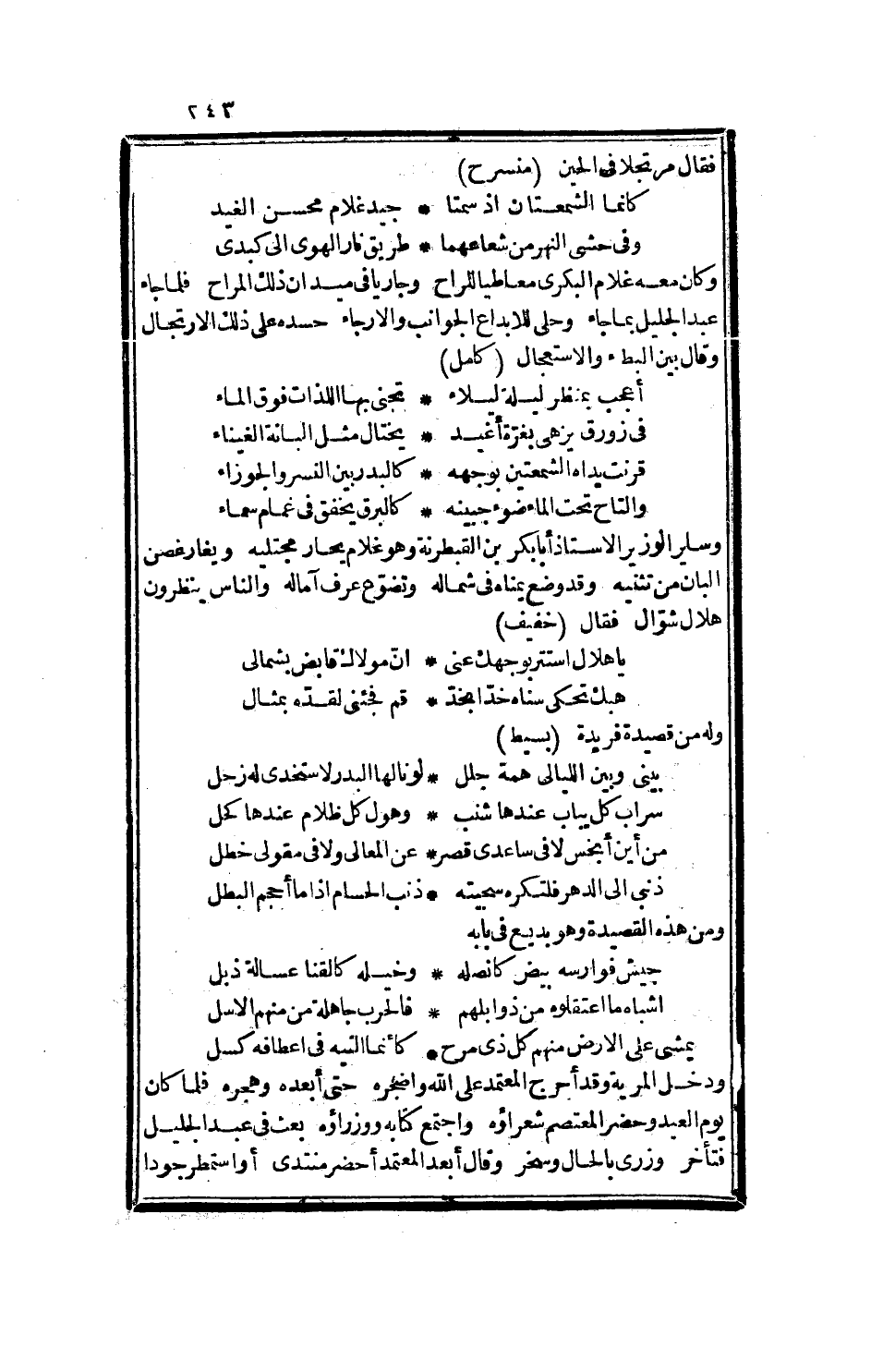وعلق بأشبيلية أحد فتيانها وأنجد عيانها، وكان أجمل من جال في خلد، واستظال على جلد، وهام به هيام الأخوص بدعد، والرعي بهند بني سعد، وكان الفتى ينافر وصله، ويطرد في مباعدته أصله، إلى أن أطل شعر عرضه، وذل لمعارضه، فعاد إلى مساعدته، واستعاد بدنوه من مباعدته، فقال: [بسيط]