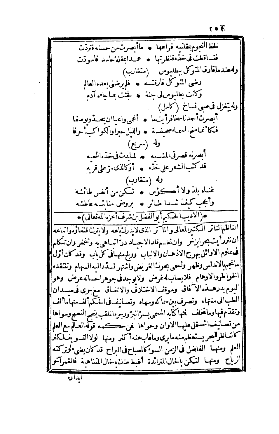 من سال فلم يعط وإنما المحروم من أعطي فلم يأخذ، ومنها يا ابن آدم تذم أهل زمانك وأنت منهم كأنك وحدك البري، وجميعهم الجري، كلا بل جنيت وجني عليك، فذكرت مل لديهم ونسيت ما لديك، ومنها اعلم أن الفاضل الزكي لا يرتفع أمره، أو يظهر قدره، كالسراج لا تظهر أنواره، أو يرفع مناره، والناقص الدني لا يبلغ لنفعه، إلا بوضعه، كهوجل السفينة لا ينتفع بضبطه، إلا بعد الغاية من حطه، ول قصل من رسالة،، توسل الهمم، أعزك الله توسل الذمم، ورب راق، بوسيلة، ذي اشتياق واستباق، إلى فضليه، رصد، فقصد، واحتشد، فتحرى الرشد، ولما طلع بك المجد، من معالمه، وأينع لك الحمد، من كمائمه، فلاح محياك قمراً زاهراً، وفاحت سجاياك سحراً عاطراً، وأنار بأفقك منار الأنوار، ودار على قطبك مدار الفخار، وخف لديك بالقلوب وارتياحها، وصار إليك بالنفوس جناحها، فجوامع الجوانح لديك حضور، ونواظر الخواطر إليك صور، وقد تخيلتك نظرات الغيوب، وتيمتك خطرات القلوب، فحنت إليك حنين اليفن إلى صباه، واهتزت اهتزاز الغصن إلى صباه، ولا غرو أن أرمت أليك القلوب بأرواحها، وتلقتك العيون بالتماحها، فقد يرقب الصباح، ويلمح القمر اللياح، وليس على عاشق الفضل جناح، وكتب إلى وزير، أطال الله بقاء الوزير الأمجد، الأجل الأوحد، وأعلى مرتقاه في رفعة العز، ومنعة الحرز، الوزير الأمجد دام الله عزه كالمطر الجود يملأ الحياض، وينبت الرياض، بل كالقمر يقذف بالنور، ويذهب بالديجور، وقد أتحفني في سناه، وسقاني من سقياه، بما أنار فأضوى، وجاد فأروى، فلله إيادي الوزير ما أنزلها بكل فناء، واسمعها لكل نداء، حين رعى قصدي وهو مجفي، ووعى صوتي وهو خفي، فالآن أدام الله رفعة الوزير أضرب بحسام، اعتناؤه جرده، حتى أظهر في سمائه، واشتهر بأرفع أسمائه،، ومن بديع قوله في قصيدة أولها، بسيط