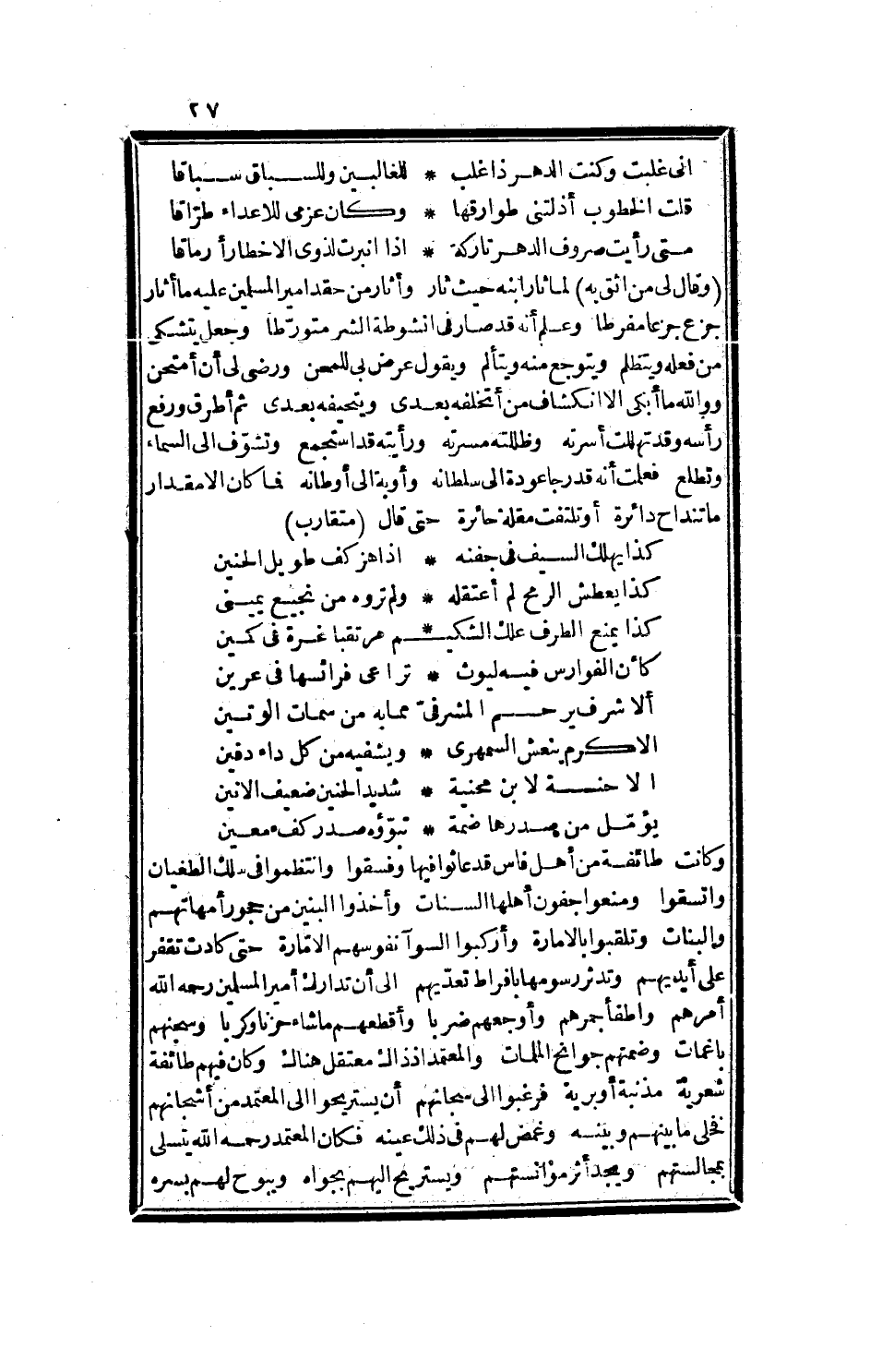 ووالله ما أبكي إلا انكشاف من أتخلفه بعدي، ويتحيفه بعدي، ثم أطرق ورفع رأسه وقد تهللت أسرته، وظللته مسرته، ورأيته قد استجمع، ولشوف إلى السماء وتطلع، فعلمت أنه قد رجا عودة إلى سلطانه، وأوبة إلى أوطانه، فما كان إلا مقدار ما تنداح دائرة، أو تلتفت مقلة حائرة، حتى قال: متقارب