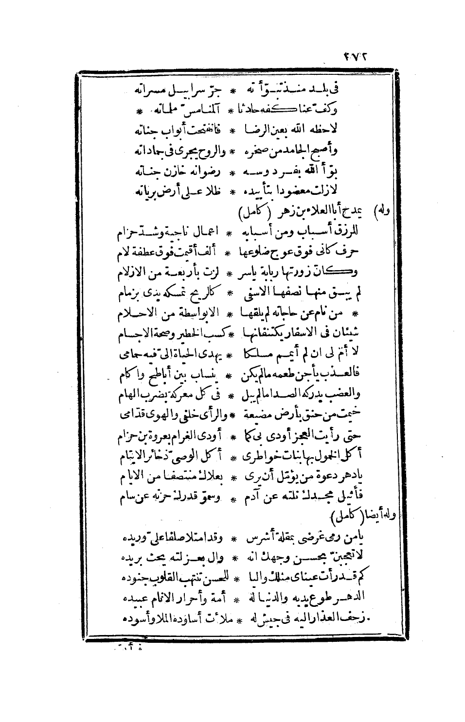 له ذهن يكشف الغامض الذي يخفى، ويعرف رسم المشكل وإن كان قد عفا، أبصر الخفيات بفهمه، وقصر فكها على خاطره ووهمه، فجاء بالنادر الذي أعجز، وعطل التطويل بالمقتضب الموجز، ونظم أخبار الأمم المتفرقة في لبة القريض، وأسمعها الطرب في نغم معبد والغريض، وكان بالأندلس سراً للإحسان ومزرئا على زياد وحسان، إلا أنه اختصر، حين احتضر، واعتبط، عنما استبشر به واغتبط، فلم يطل زمانه، ولم يهطل داركاً عنانه، وأغفل الأوان من وسمه، وأثكل لفقد اسمه، فأصبحت نواظر الآداب بعده رمدة، ونفوسها متوجعة كمدة، وقد أثبت له ما يبهر سامعه، ويثني إليه الإحسان مسامعه، فمن ذلك قوله: بسيط