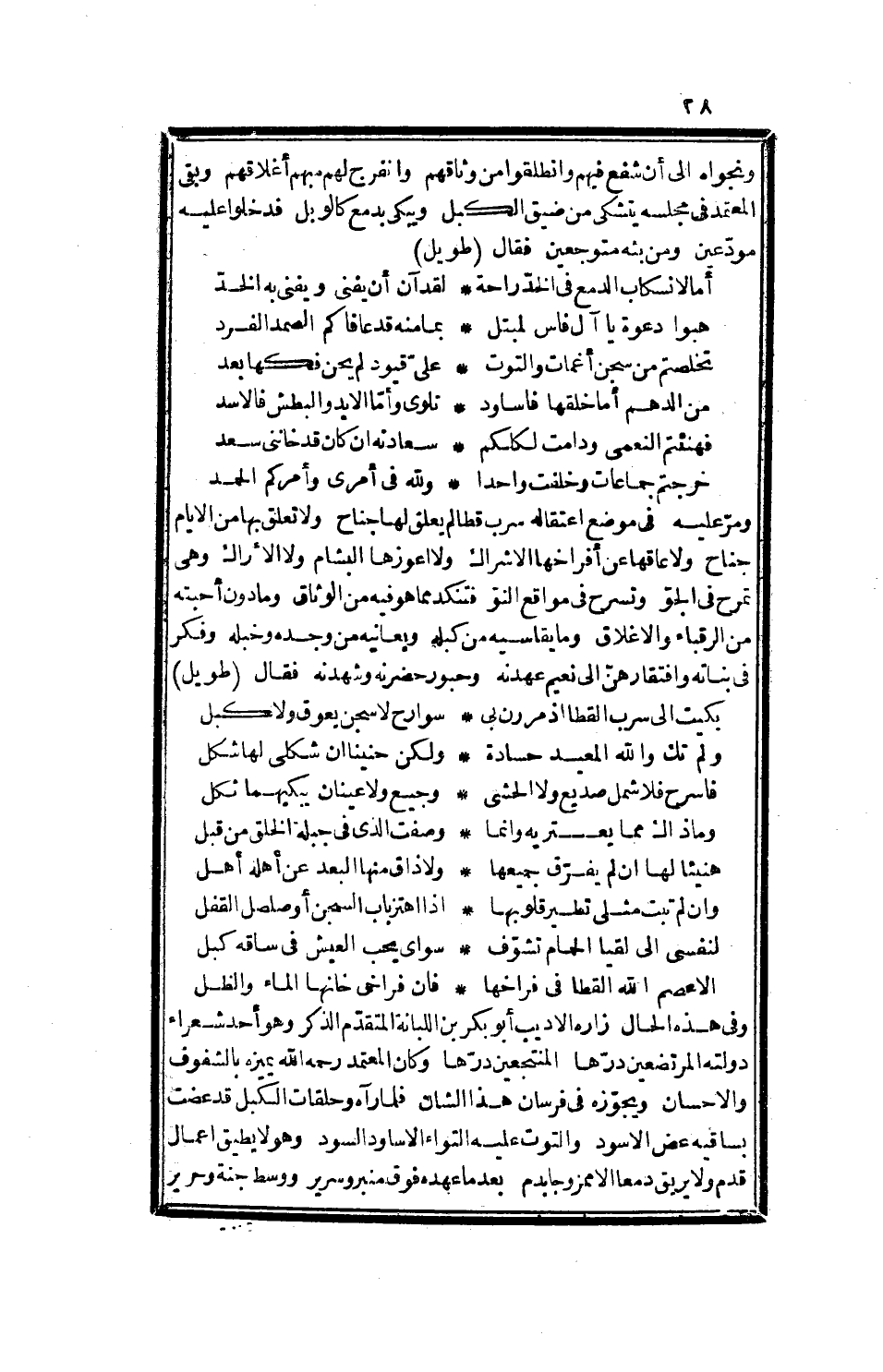 ومر عليه في موضع اعتقاله سرب قطا لم يعلق لها جناح، ولا تعلق بها من الأيام جناح، ولا عاقها عن أفراخها الأشراك، ولا أعوزها البشام ولا الأراك، وهي تمرح في الجو، وتسرح في مواقع النو، فتنكد مما هو فيه من الوثاق، وما دون أحبته من الرقباء والأغلاق، وما يقاسيه من كبله، ويعانيه من وجده وخبله، وفكر في بناته وافتقارهن إلى نعيم عهدنه، وحبور حضرته وشهدنه، فقال: طويل