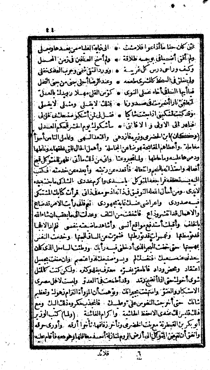 وكان ابن الحضرمي وزيره فازدهى، واقتعد السهى، وعامل الناس أسوأ معاملة، وأعطاهم المقابحة عوضاً من المجاملة، وأهمل الحال التي علقها به وناطها، ودمرها عليه وما حاطها، ولما تجبر وعتا، وأتى من ذلك ما أتى، ظهر للمتوكل قبح أفعاله، واحتذائه بالنجم وانتعاله، فأقعده عن رتبته، وأبعده عن خدمته، فكتب إليه يستعطفه، فراجعه المتوكل، يا سيدي وأكرم عددي، الشاكي ما جنته يده لا يدي، ومن أسأل الله له التوفيق في ذاته، إذ حرمه في ذاتي، قرأت كتابك المتشكي فيه صدوري، وأعراضي عنك غاية مجهودي، نعم فإني رأيت الأمر قد ضاع، والأدبار قد انتشر وذاع، فأشفقت من التلف، وعدلن إلى ما يعقب إن شاء الله بالخلف، وأقبلت استدفع مواقع أنسي، وأشاهد ما ضيعته بنفسي، فلم أر إلا لحجاً قد توسطتها، وغمرات قد تورطتها، فشمرت عن الساق بلجمتها، وخدمت النفس بمهجتها، حتى خضت البحر الذي أدخلني فيه رأيك، ووطيت الساحل الذي كان يبعدني عنه سعيك، فنفسك لم، وبسوء صنيعك لذا واعتصم، وإن مت بجميل اعتقاد، ومحض وداد، فأنا مقر بغره، معترف بقله وكثره، ولكن كنت كالمثل شوى أخوك حتى إذا انضج رمد، وقد أطعمت في العدو، ولبست لأهل مصري الاستكبار والعتو، واستهنت بجيرانك، وتوهمت أن المروءة التزام زهوك وتعظيم شانك، حتى أخرجت النفوس على وعليك، فانجذب مكروه ذلك غليك، ومع ذلك فليس لك عندي إلا حفظ الحاشية، وإكرام الغاشية، ولما كتب الوزير أبو بكر بن القبطرنة مع بنت الحضرمي، وتأخر زفافها تأخراً أرقه، وأورى حرقه، واتفق أن نهض المتوكل إلى أرض الروم، لمنازلة أحد معاقلها وهو معه فأقام معه إلى أن فتحه، وأنهج له الظفر سعيه وأوضحه، فصدر والفتنة قد أنشبت أظفارها، وأعملت أسنتها وشفارها، وأغطشت ليلها، وأجالت في عراصه خيلها، فكتب إليه، ومملوكك قبل التهنئة: