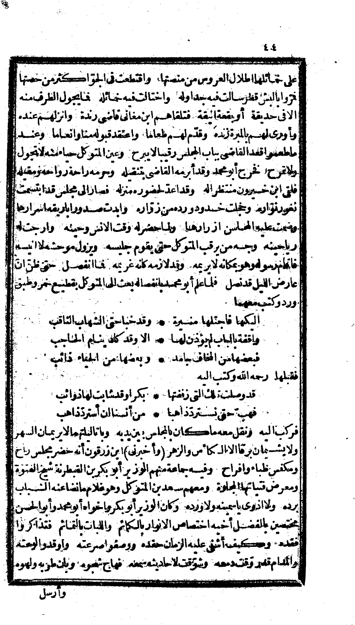 فركب إليه، ونقل معه ما كان بالمجلس بين يديه، وباتاً ليلتهما لا يريمان السهر، ولا يشيمان برقاً إلاّ الكاس والزهر، وأخبرني ابن زرقون أنه حضر مجلس راح، ومكنس ضباء وأفراح، وفيه جماعة منهم الوزير أبو بكر بن القبطرنة شيخ الفتوة، ومعرض فتياتها المجلوة، ومعهم سعد ابن المتوكل وهو غلام ما نضا عنه الشباب بردة، ولا اذوي ياسمينة ولا وردة، وكان الوزير أبو بكر وأخواه أبو محمد وأبو الحسن مختصين بالفضل أخيه اختصاص الأنوار بالكمائم، واللبات بالتمائم، فتذاكروا فقه، وكيف شفى عليه الزمان حقه، ووصفوا صرعته، وأوقدوا لوعته، والمدام قد روقت دمعه، وشوقت لأحاديثه سمعه، فهاج شجوه، وبان طربه ولهوه، وأرسل مدامعه سجالاً، وقال ارتجالاً: كامل