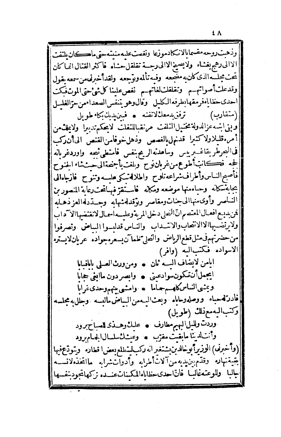 حتى الموت فبكت إحدى حظاياه فرمقها بطرفه الكليل، وقال وهو يتنفس الصعداء من حر الغليل: متقارب